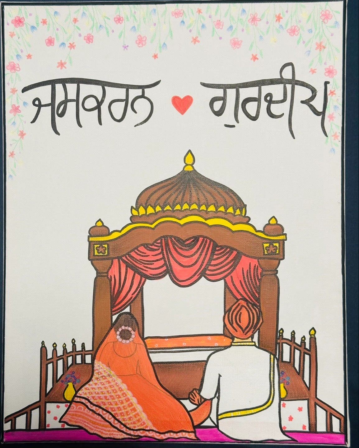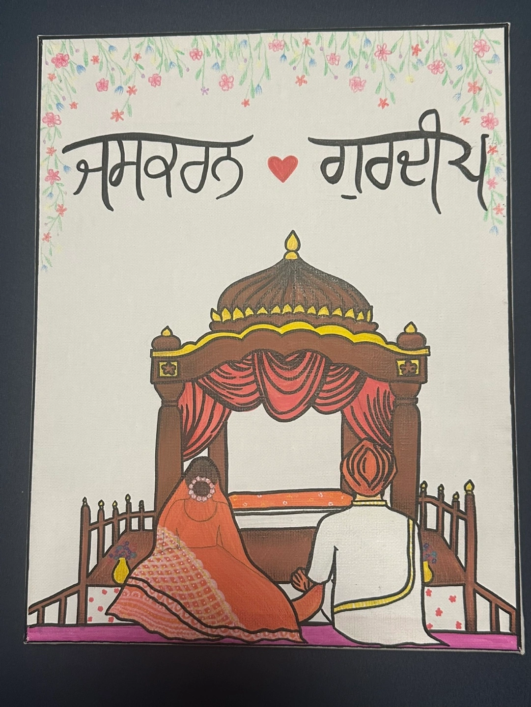 Hand-painted canvas featuring a couple in traditional Sikh wedding attire. Names written in Punjabi. Unique and personalized artwork. Perfect gift or keepsake. *Perfect for*: *Home decor *Personalized gifts *Special occasions Custom orders available - tell me your vision, and I'll bring it to life! Message me to order or you can custom any design and any name write any language like Hindi, punjabi, English Pickup & delivery options available.