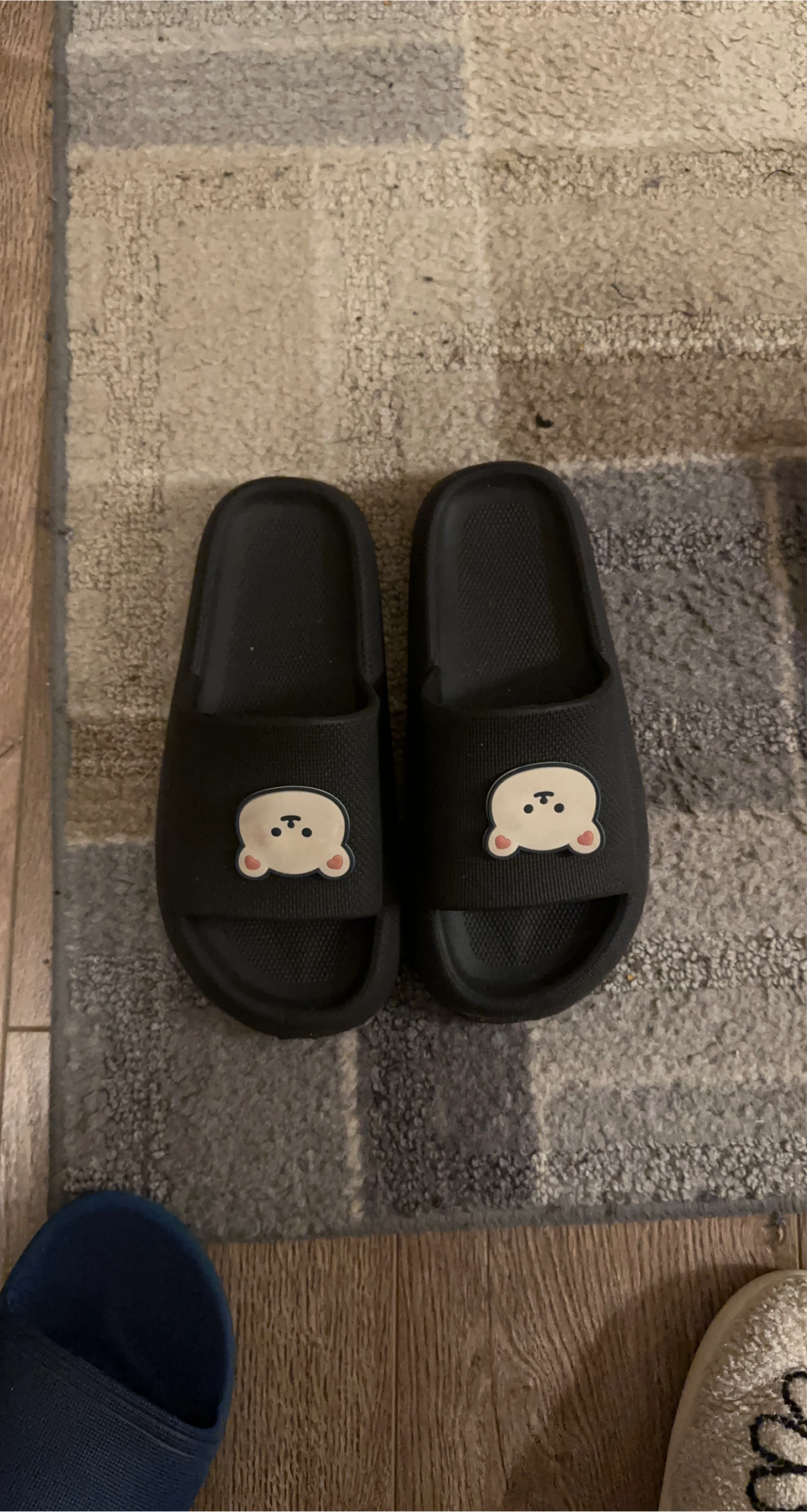 Selling a pair of black slides with a cute bear design! They're in great condition and super comfy for wearing around the house or running quick errands