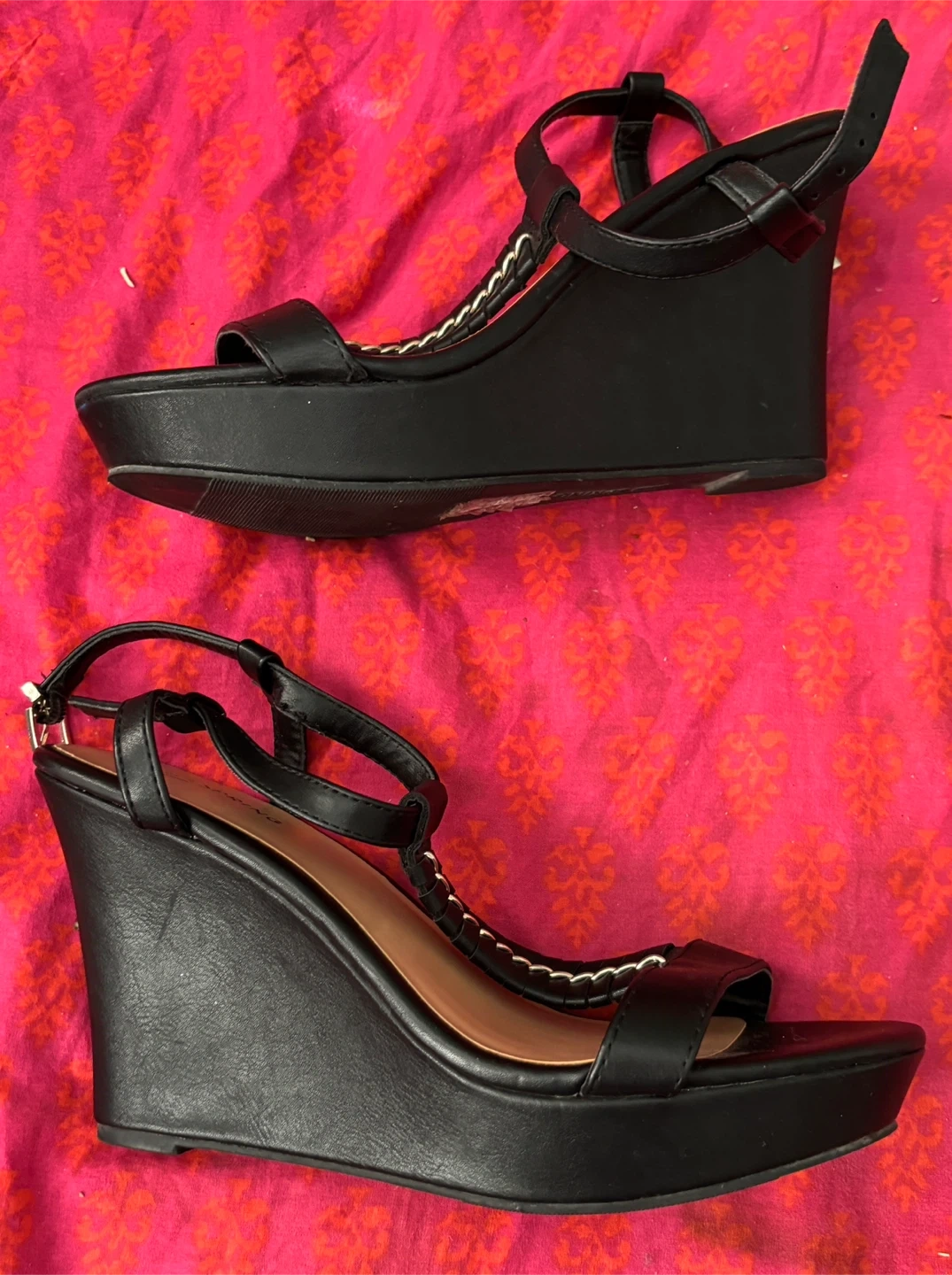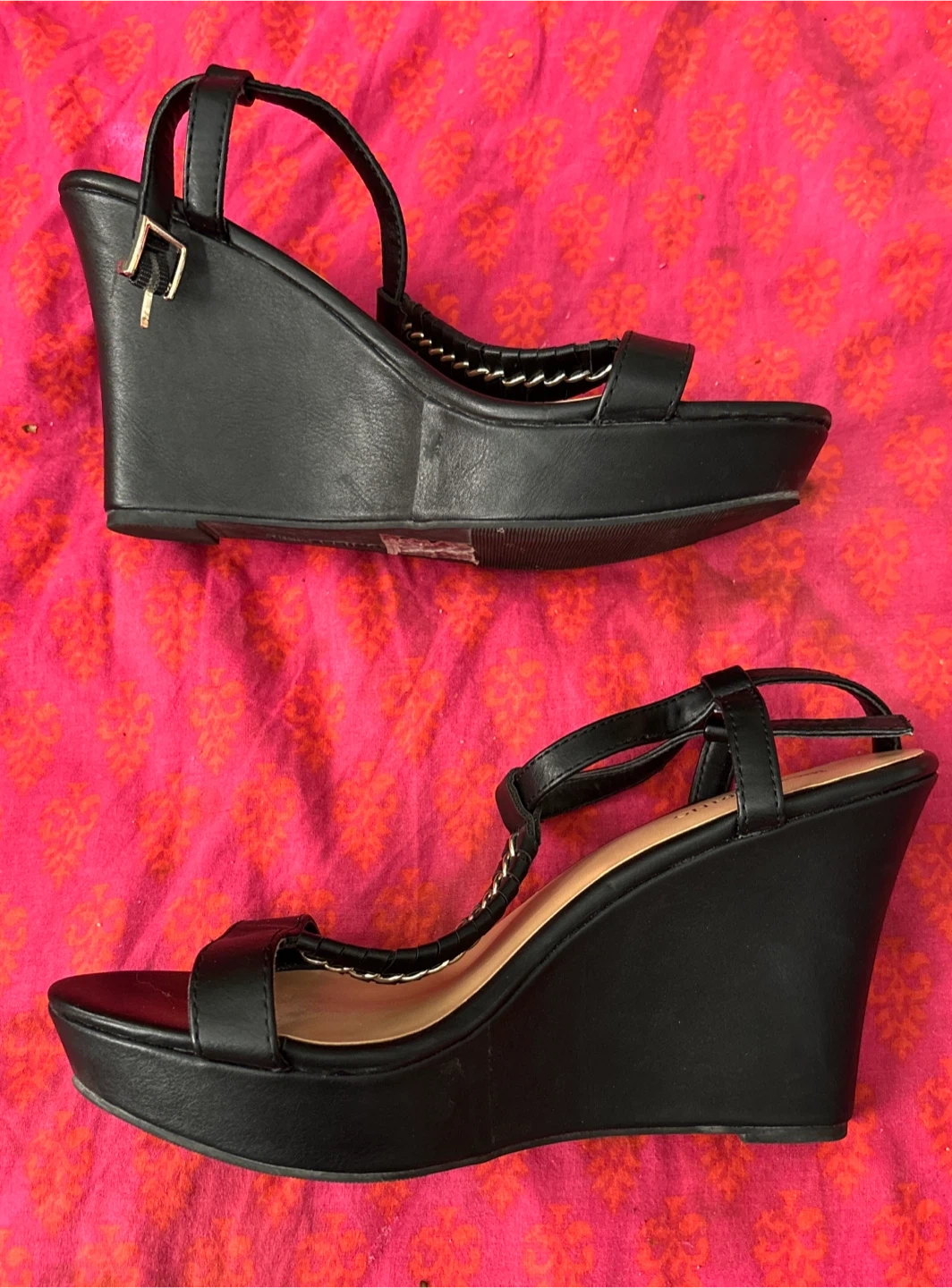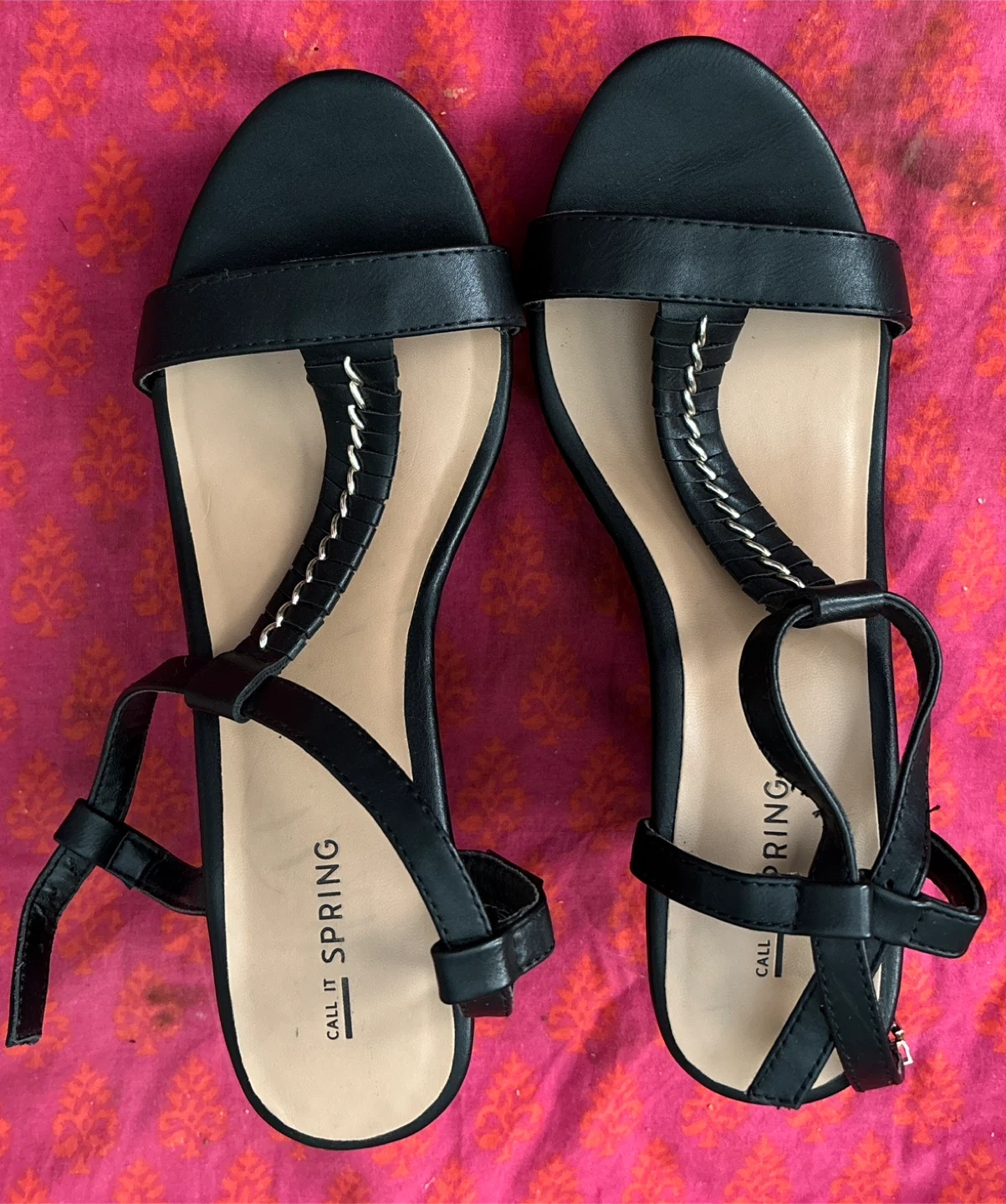 Cute black wedge sandals from Call It Spring! These have a bit of a platform and a comfortable ankle strap. Perfect for dressing up or down! Size 9.