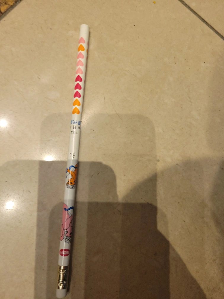 Here's another pencil with cute cartoon designs and colourful hearts! It has a white body and an eraser at the end.