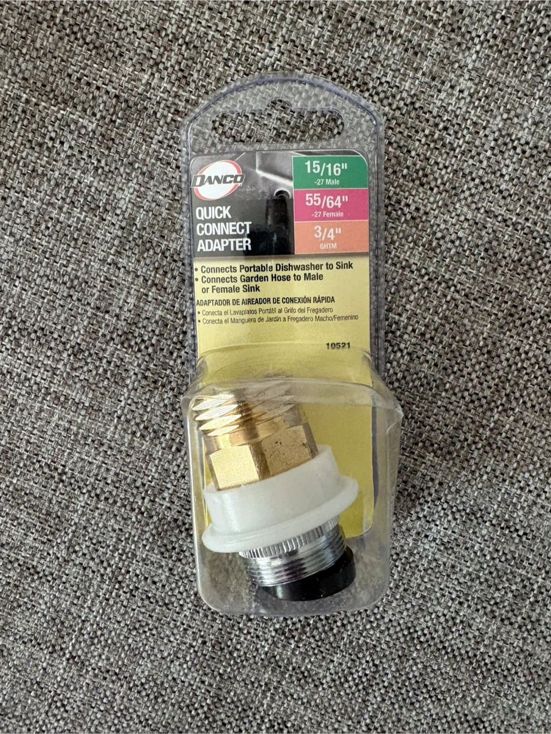 Selling a DANCO Quick Connect Adapter. It connects a portable dishwasher to the sink and also connects a garden hose to a male or female sink. The adapter is 15/16"-27 Male and 55/64"-27 Female, 3/4" GHIM. Nepean