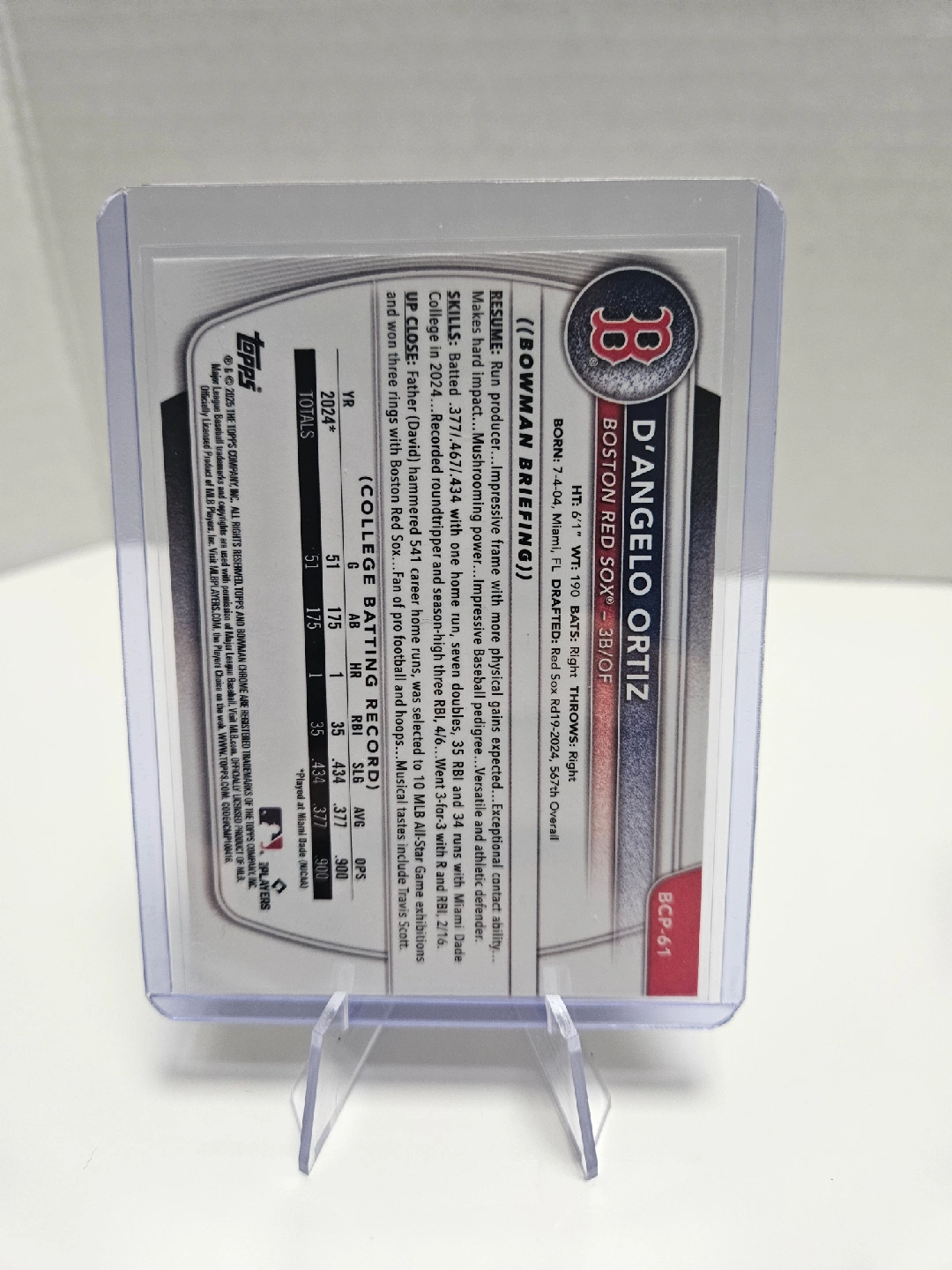 Selling a D'Angelo Ortiz Bowman Chrome baseball card! He plays for the Boston Red Sox. Card number BCP-61. A great addition to any baseball card collection Can also meet in Mississauga, Kennedy rd and Derry rd area during the week between 9am and 3pm shipping available at extra cost Check out my other listings