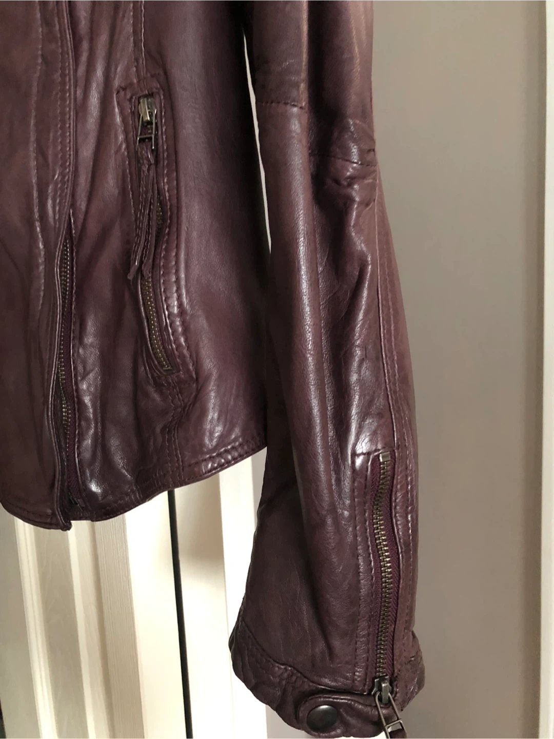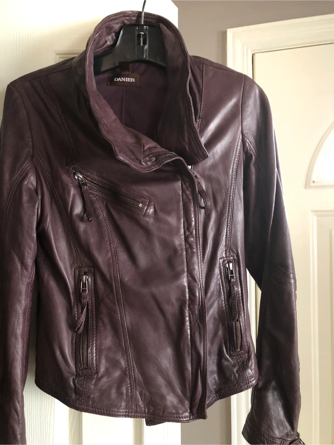 Here's a Danier leather jacket in a lovely burgundy colour! It's in great condition and features a stylish asymmetrical zipper and multiple pockets. Perfect for adding a touch of edge to any outfit