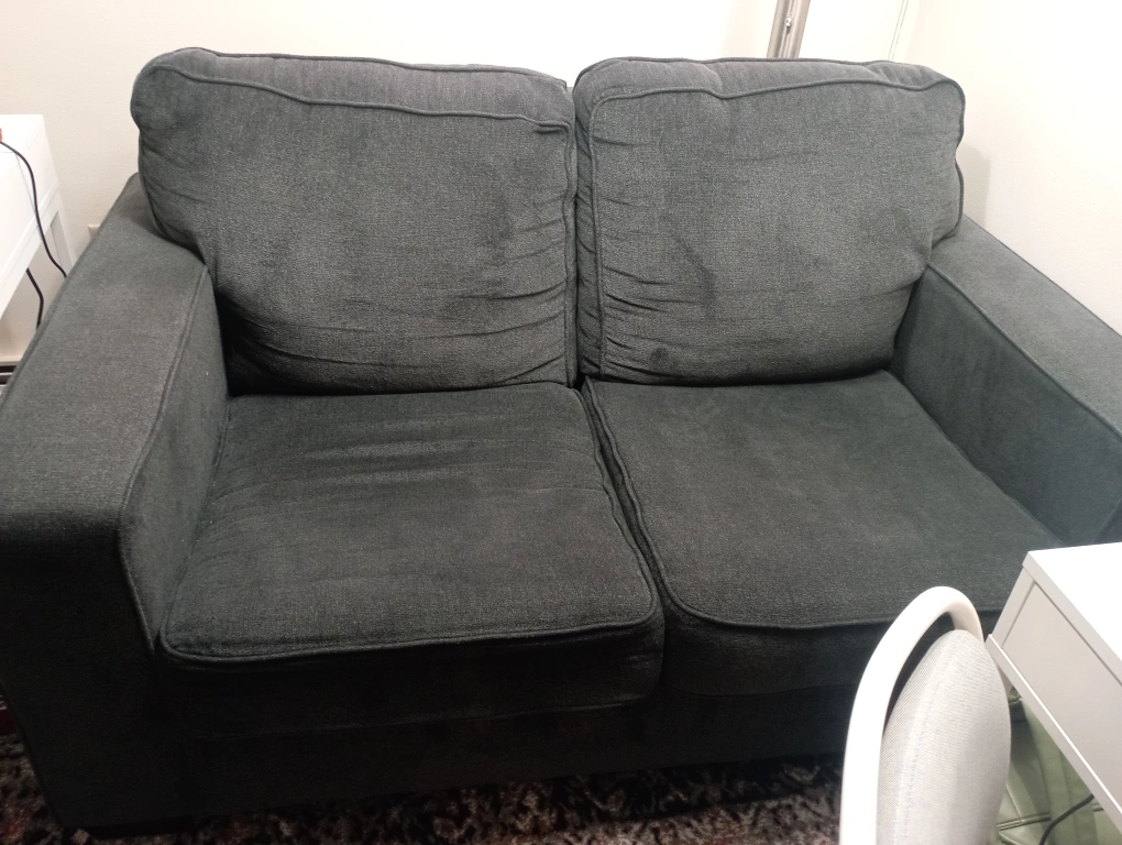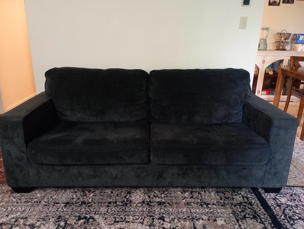 Selling a comfy dark blue loveseat sofa. It's in great condition and perfect for a small space or apartment. The material is soft and the cushions are supportive, making it a cozy spot to relax after a long day!