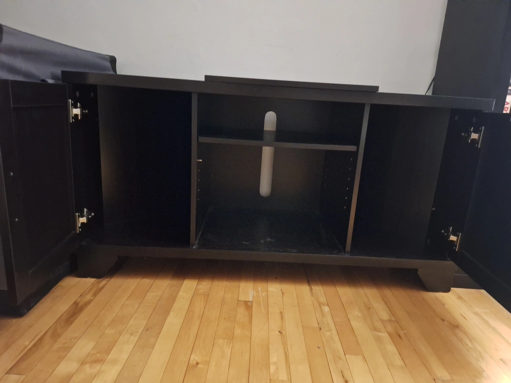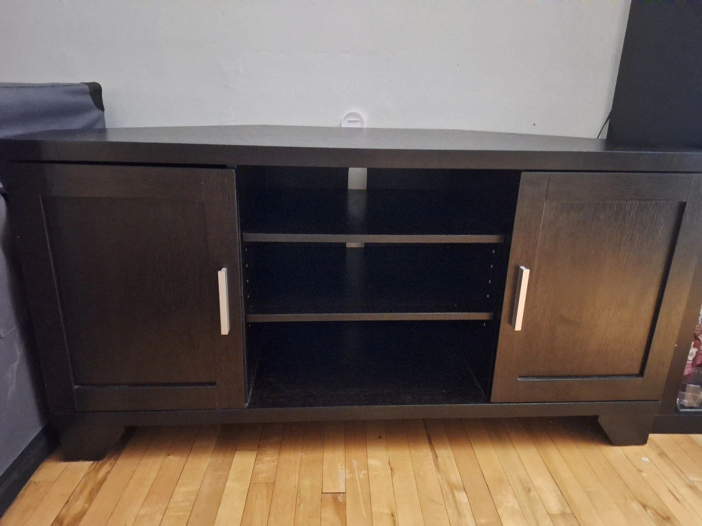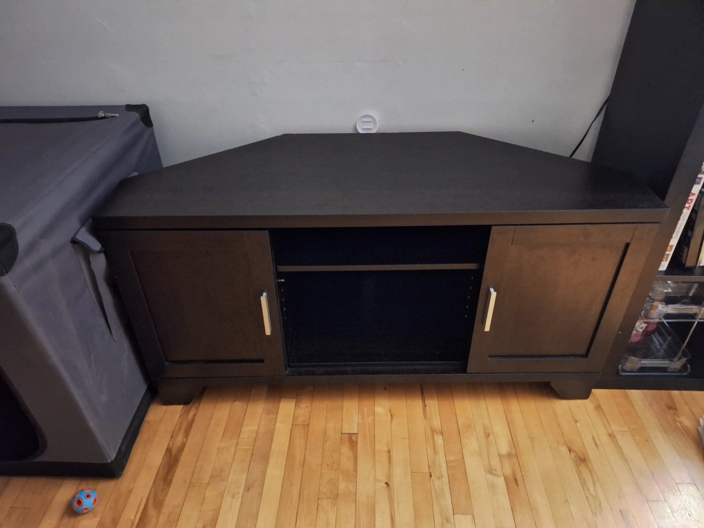 Dark brown corner TV stand with doors and shelves for storage. Perfect for a smaller space or to tuck your TV into a corner. It's in great shape with minor scuffing on the back from moving 100$ Cash and pick up only