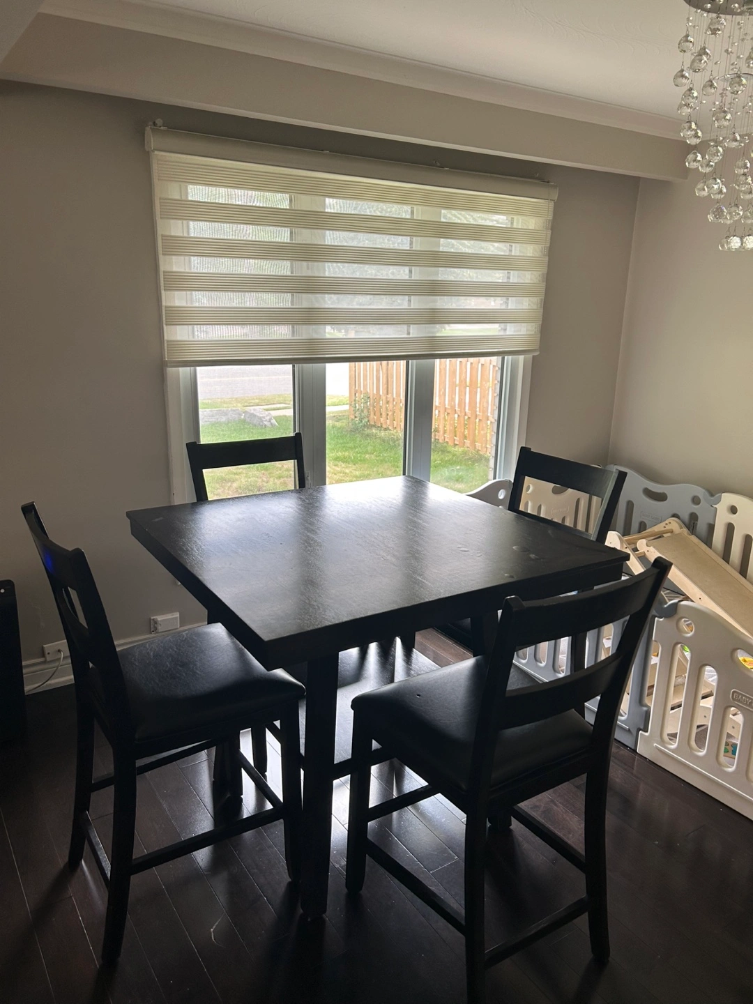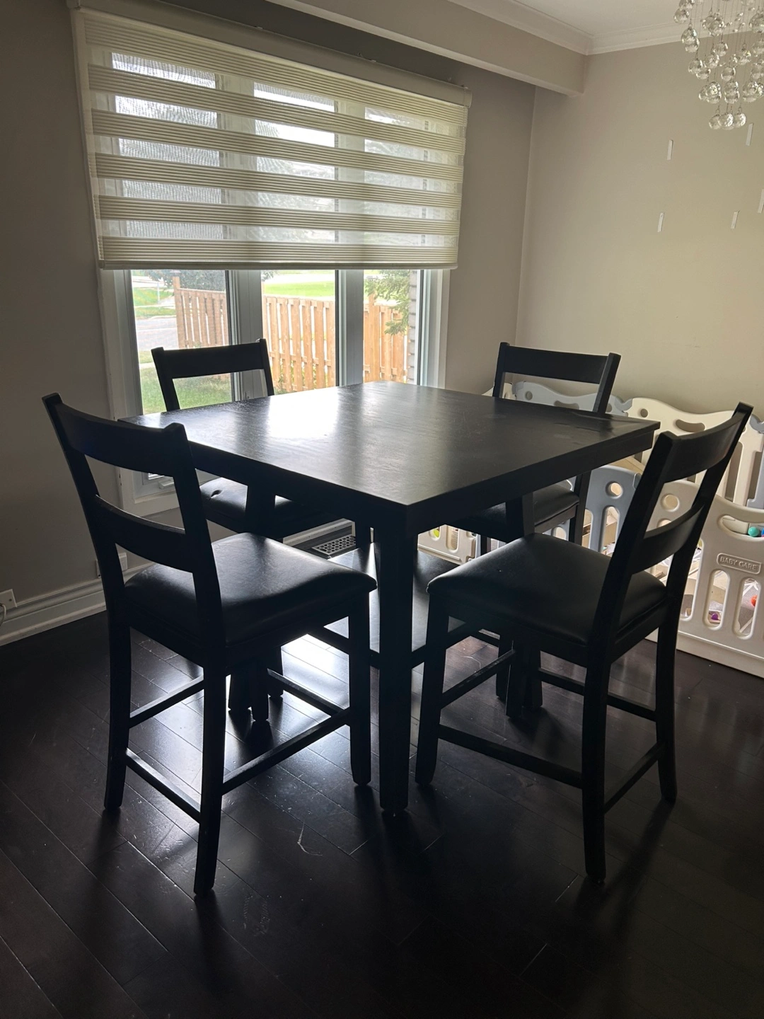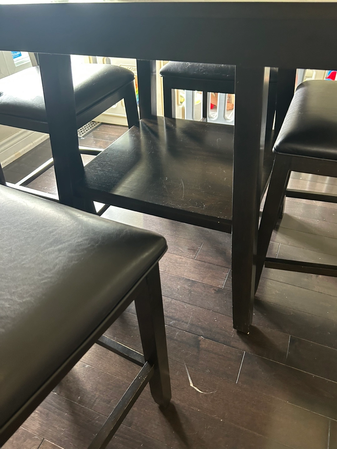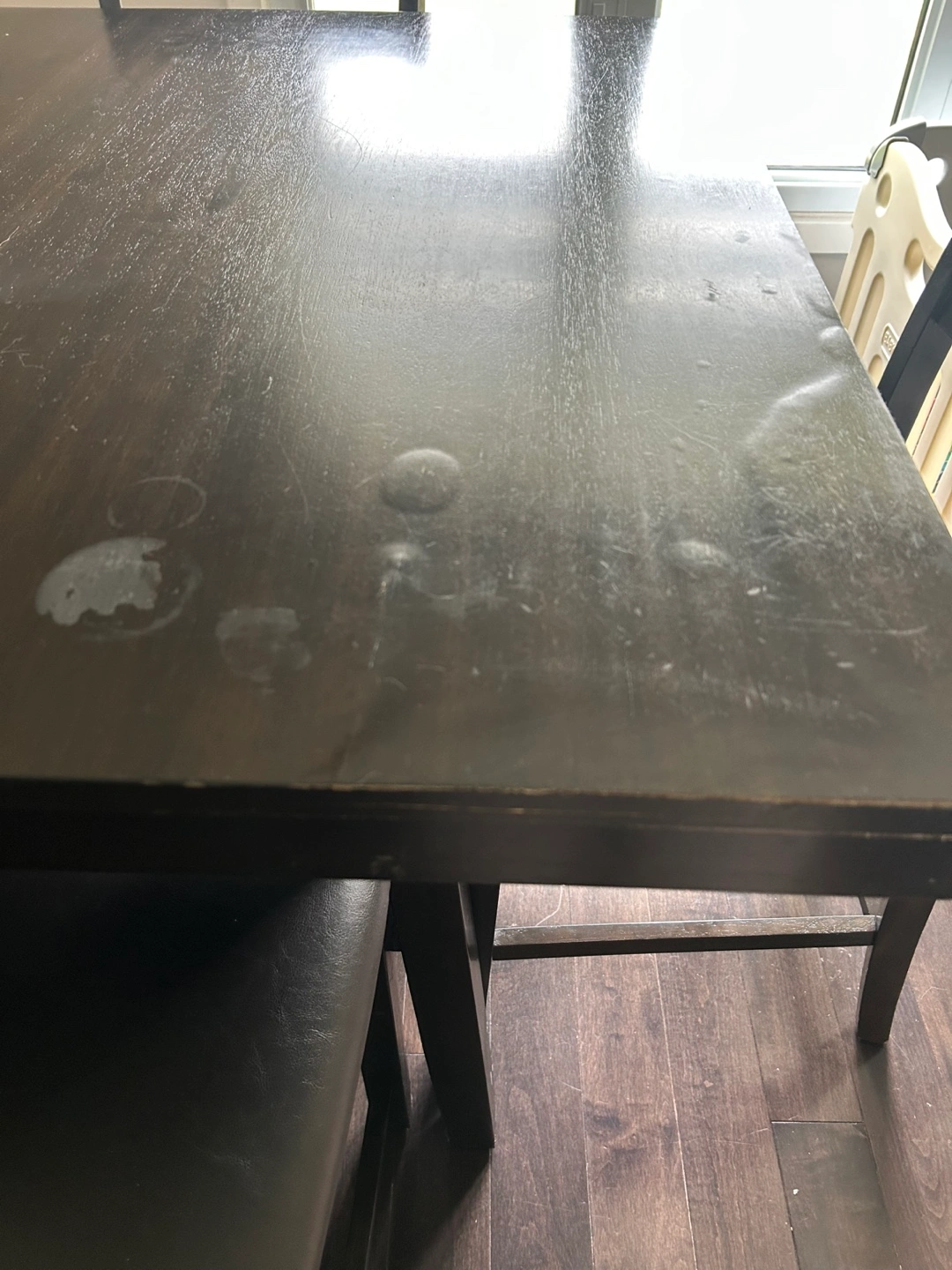 Selling a dark brown square dining table with four matching chairs. It's perfect for a smaller dining area or kitchen nook. There are some signs of use on the tabletop, as shown in the pictures, but it's still sturdy and functional. The chairs are in good condition and comfortable to sit on. It's a great set for everyday meals or casual gatherings!