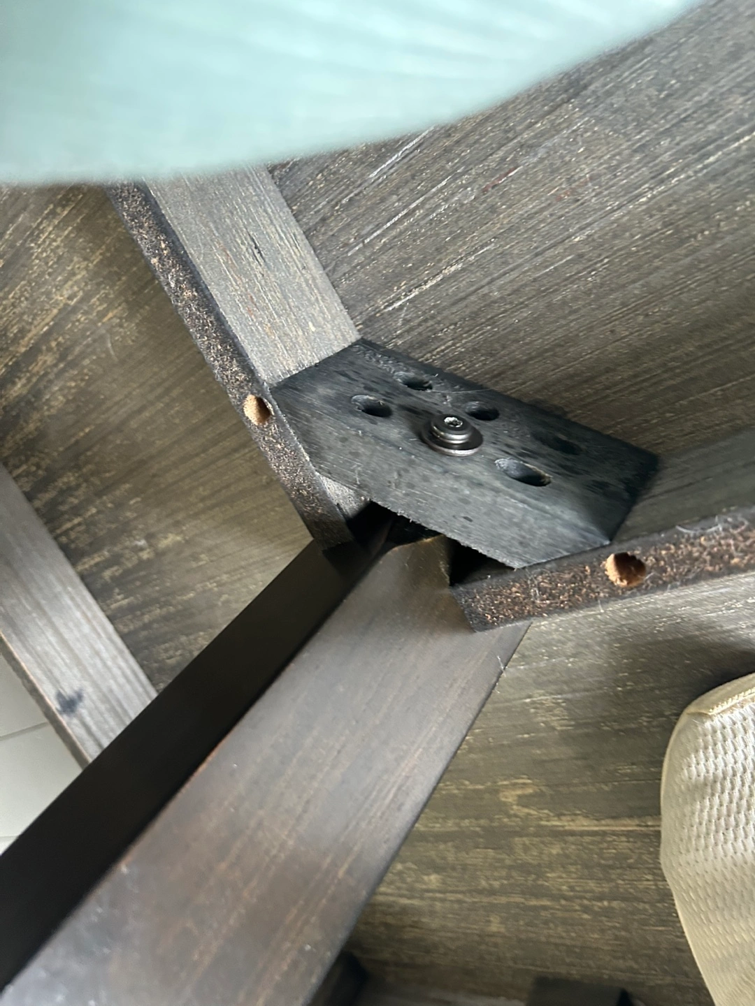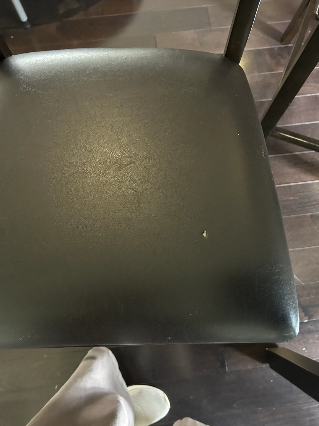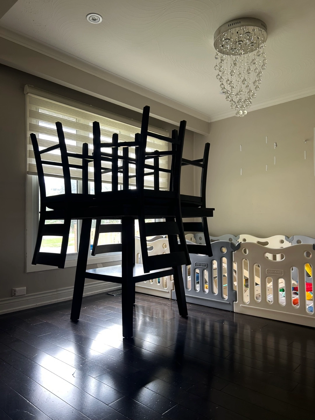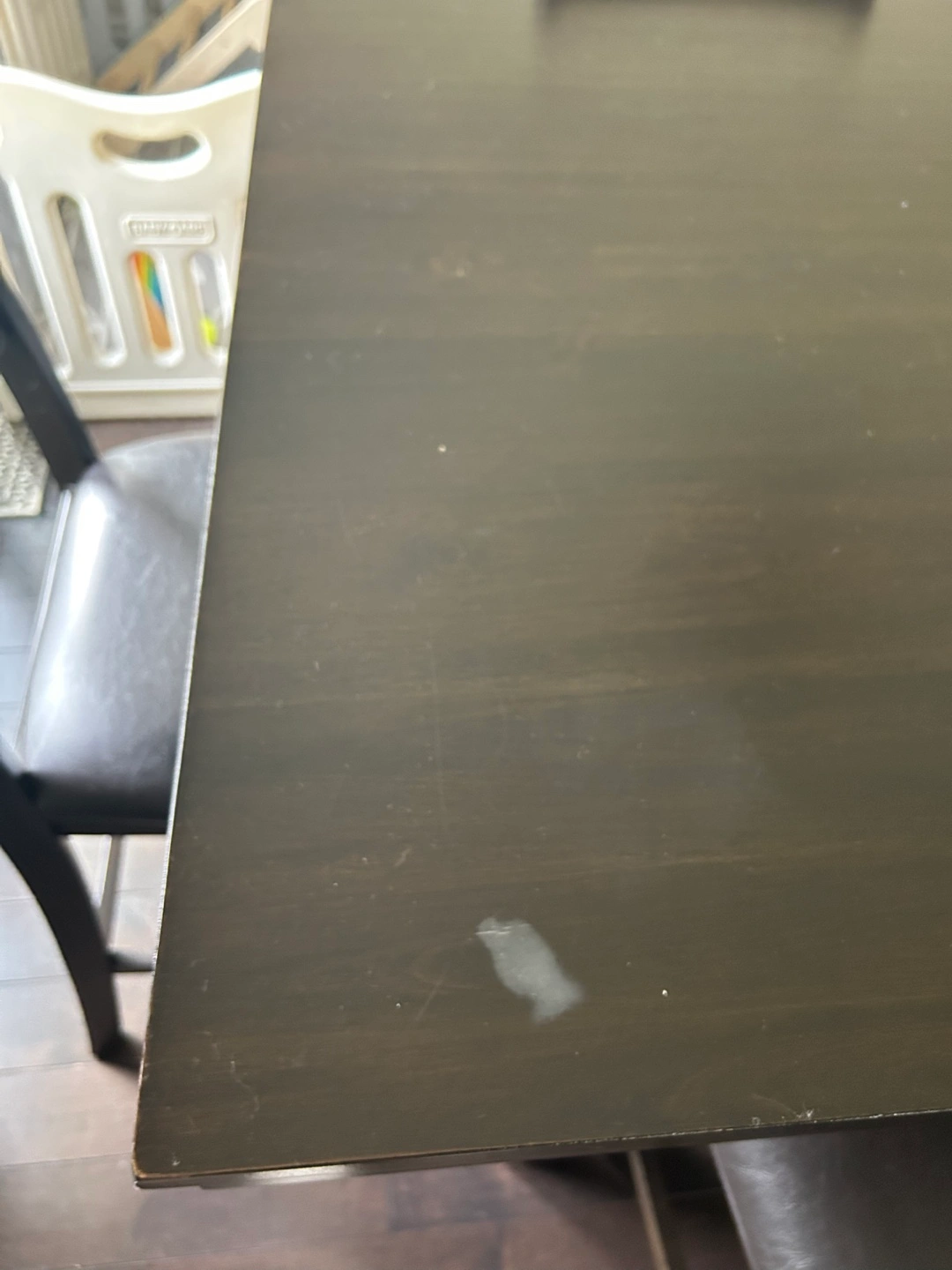 Selling a dark brown square dining table with four matching chairs. It's perfect for a smaller dining area or kitchen nook. There are some signs of use on the tabletop, as shown in the pictures, but it's still sturdy and functional. The chairs are in good condition and comfortable to sit on. It's a great set for everyday meals or casual gatherings!