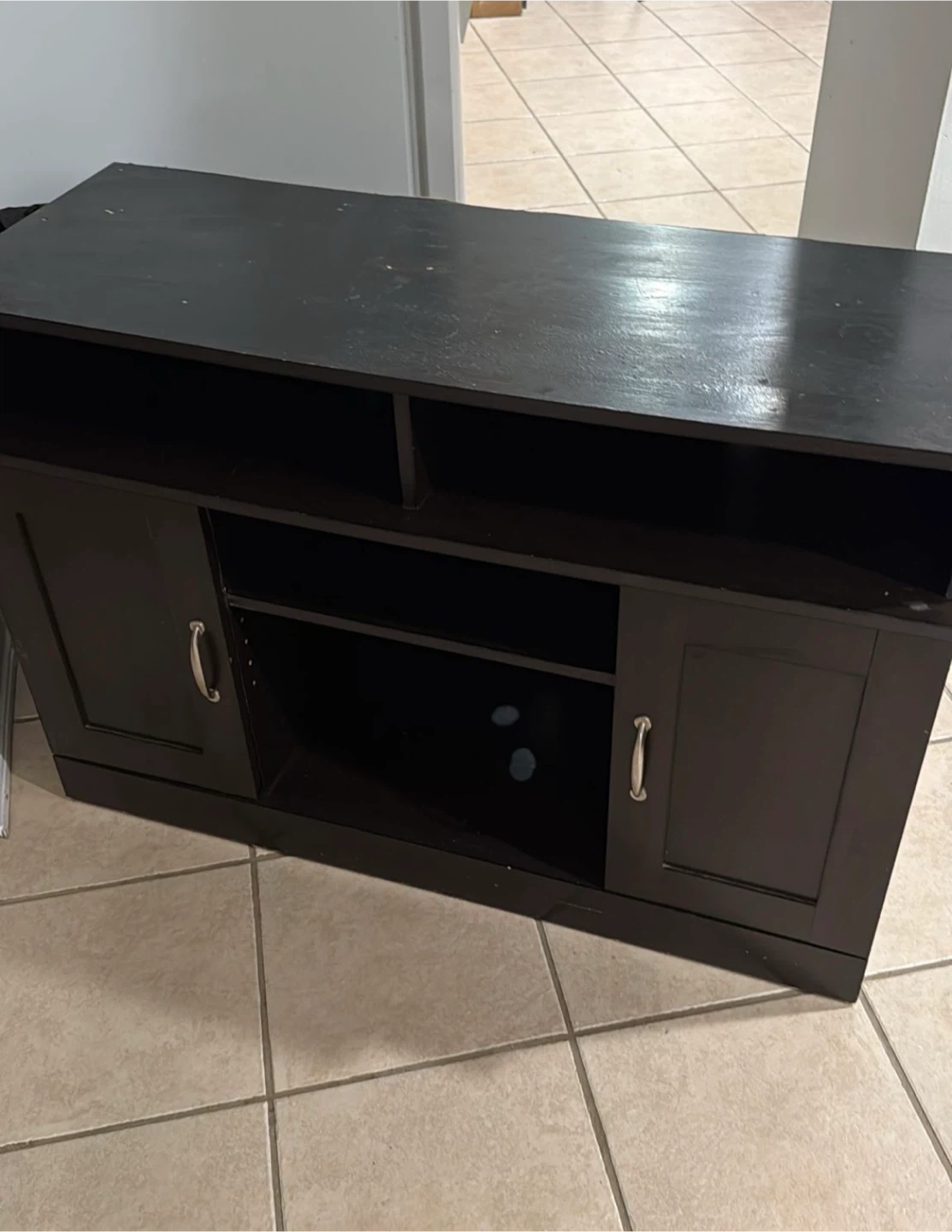 Selling a used black TV stand in good condition. Features two cabinet doors with silver handles, two open top shelves (great for consoles or receivers), and a central open space for media equipment. Some minor surface wear but structurally solid and clean. Fits TVs up to around 50 inches (please measure your TV to confirm fit).