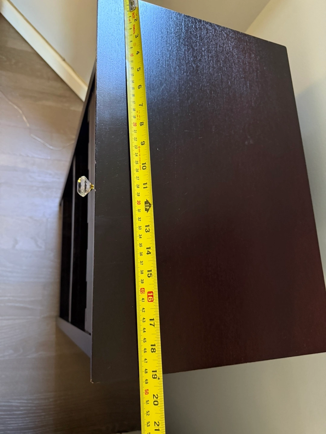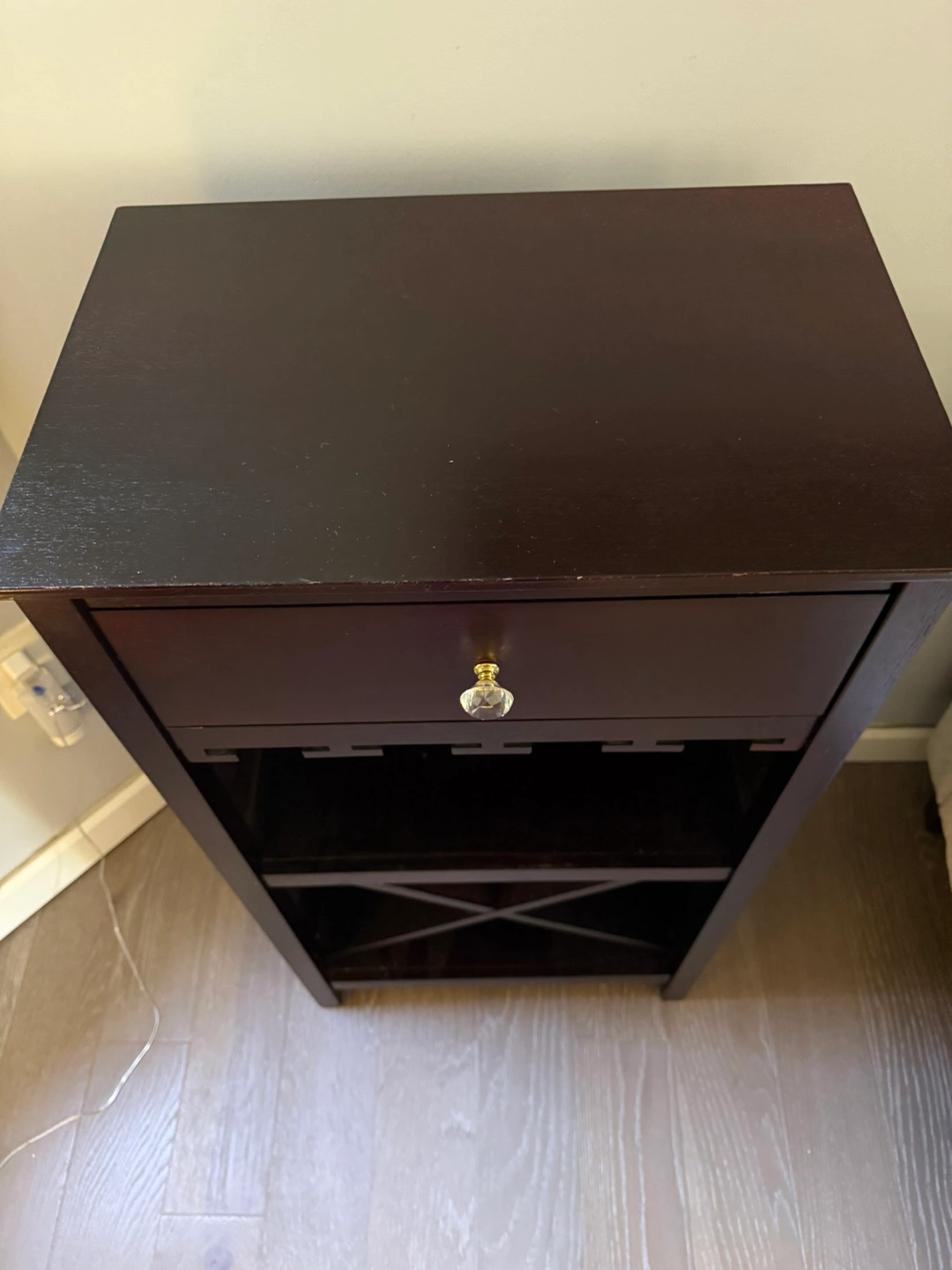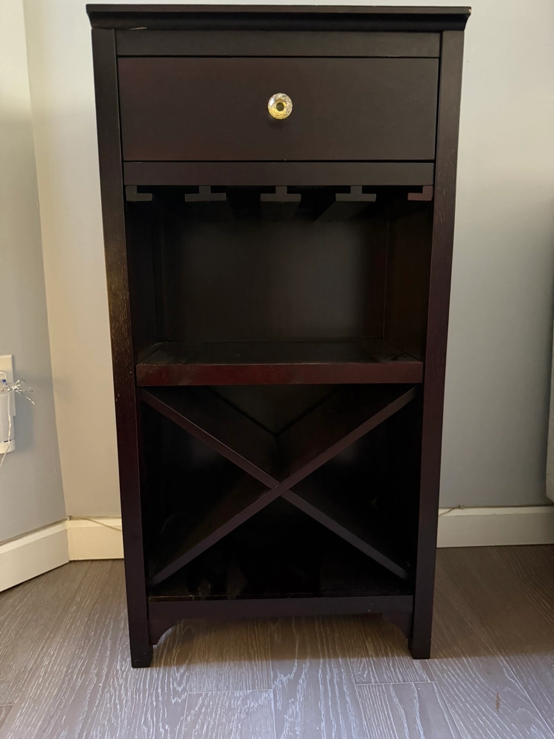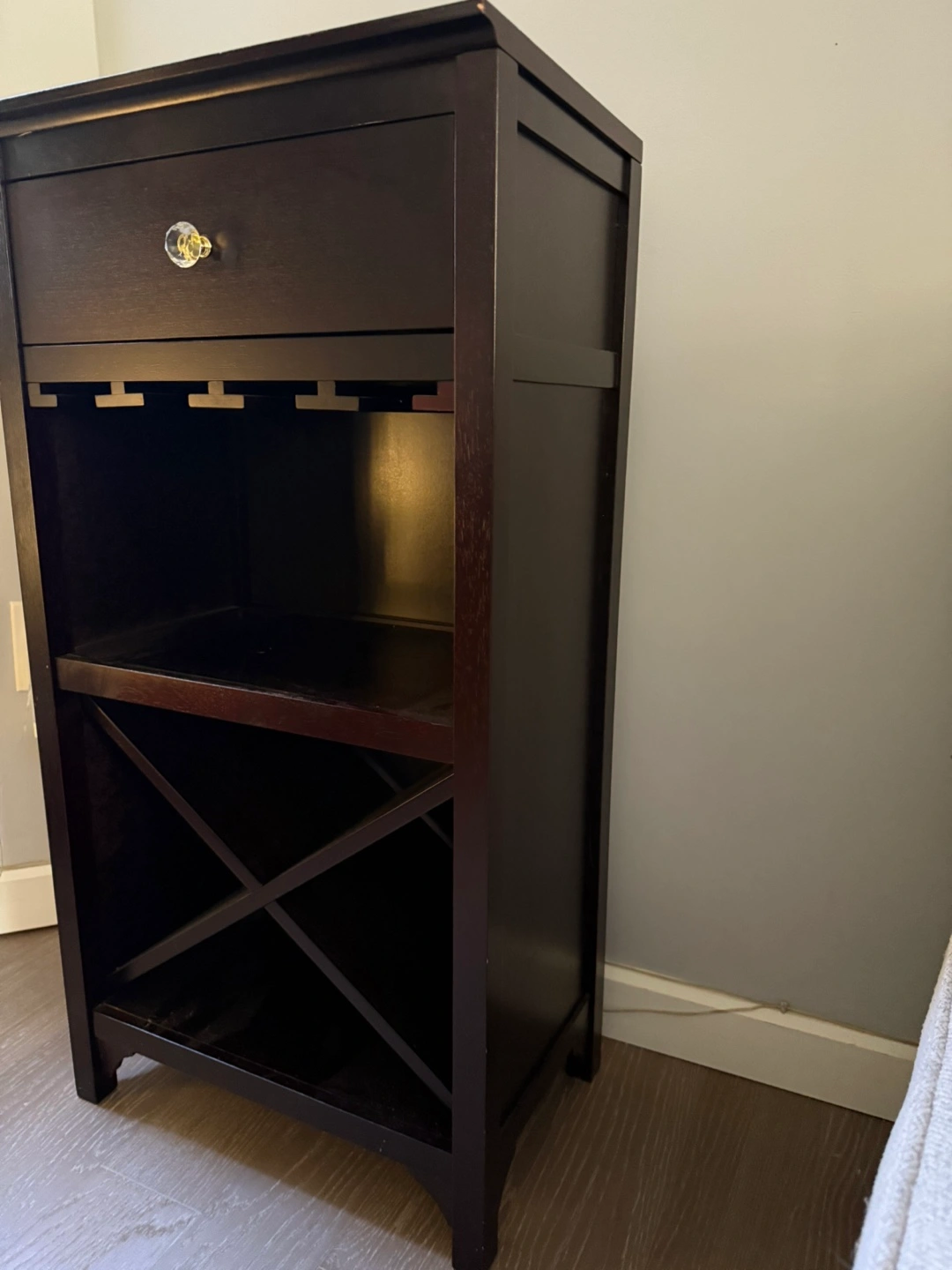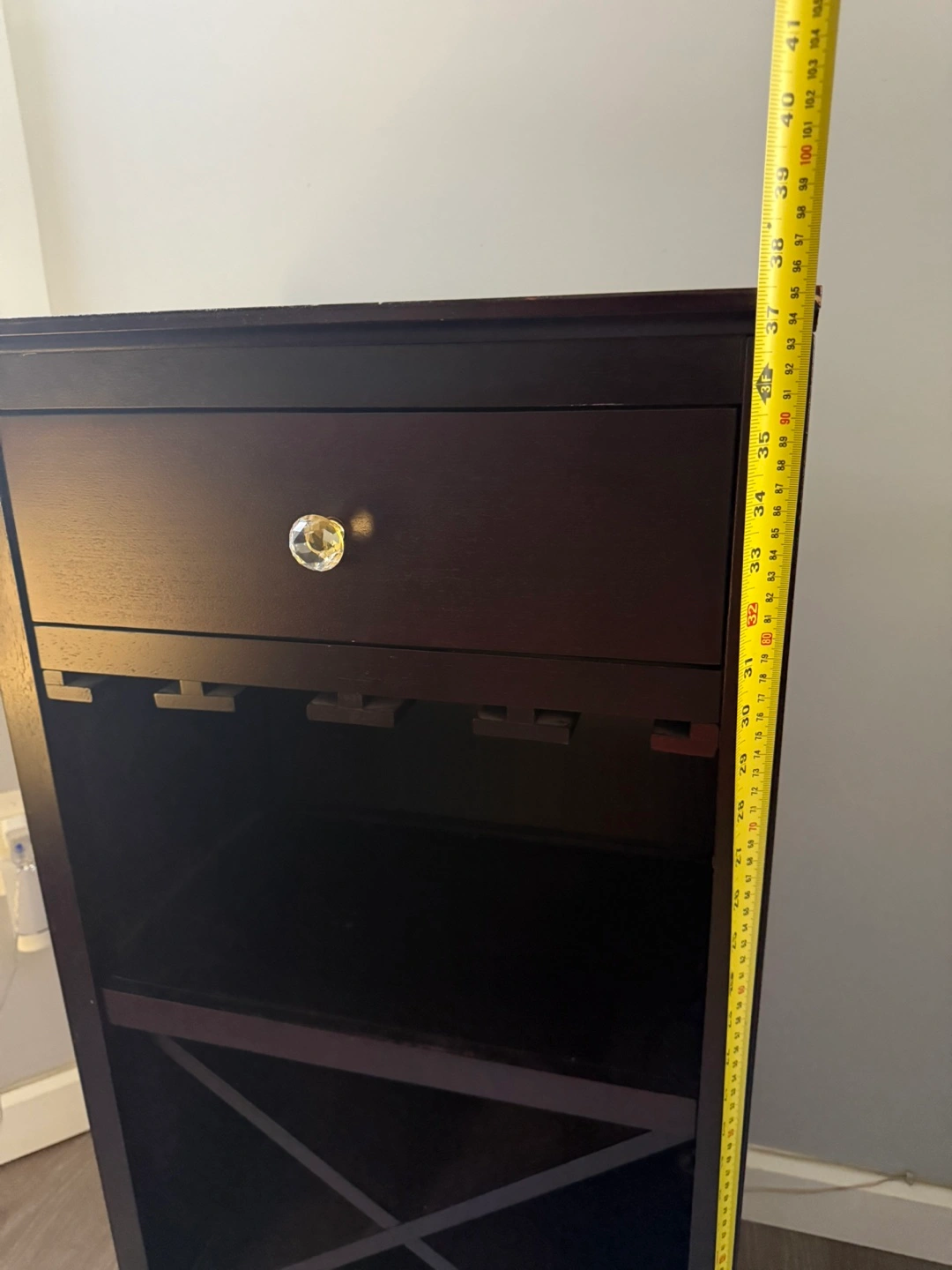 Selling a dark brown wine rack cabinet. It features a drawer, wine glass holders, and a wine bottle rack. The cabinet is approximately 37 1/2 inches tall and 19” inches wide. It's in great shape and ready to hold your favourite wines!
