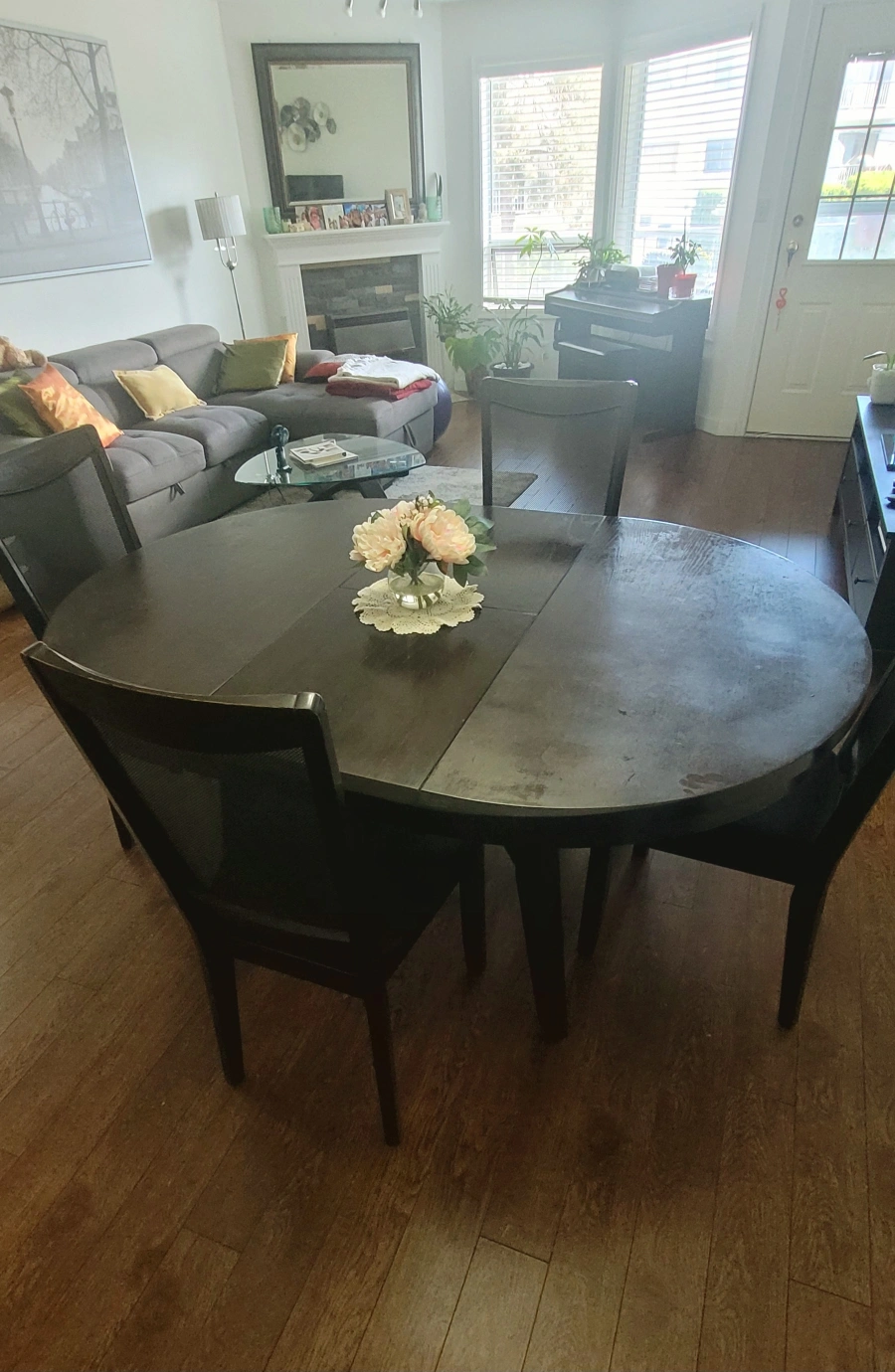 Selling a dark brown wood dining table that comes with four matching chairs. It's in good condition and would be a great addition to any dining room! The table has an oval shape when extended, the leaf is foldable inside, perfect for family dinners or gatherings with friends