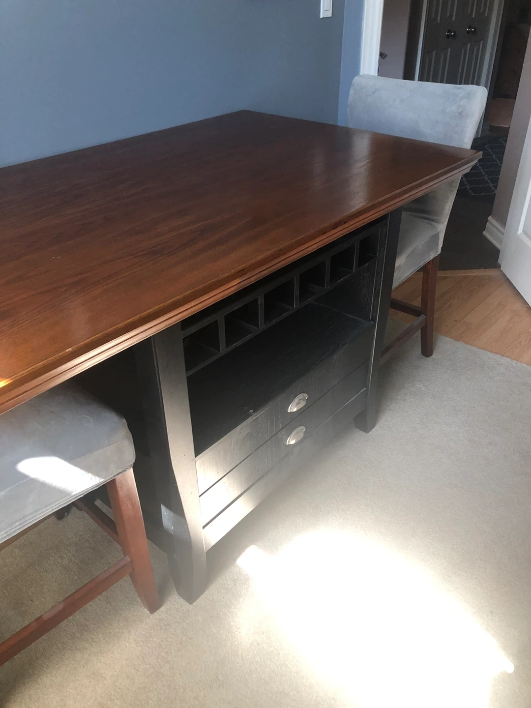 Selling a dining table with a dark wood top and black base. It features built-in storage, including a wine rack and drawers. Comes with four matching chairs with grey cushioned seats. It's in great condition and would be perfect for a smaller dining space!