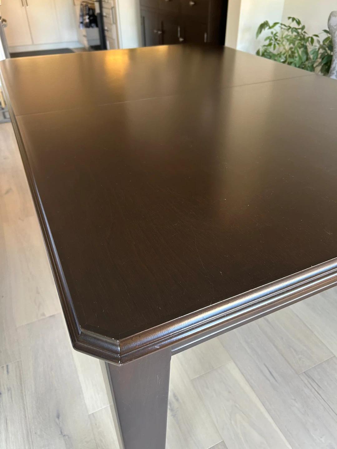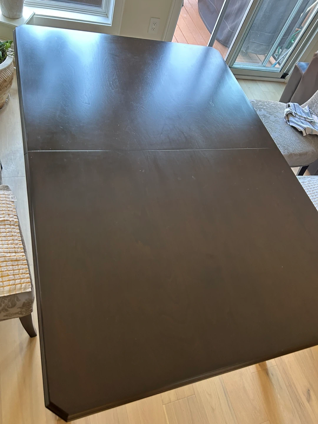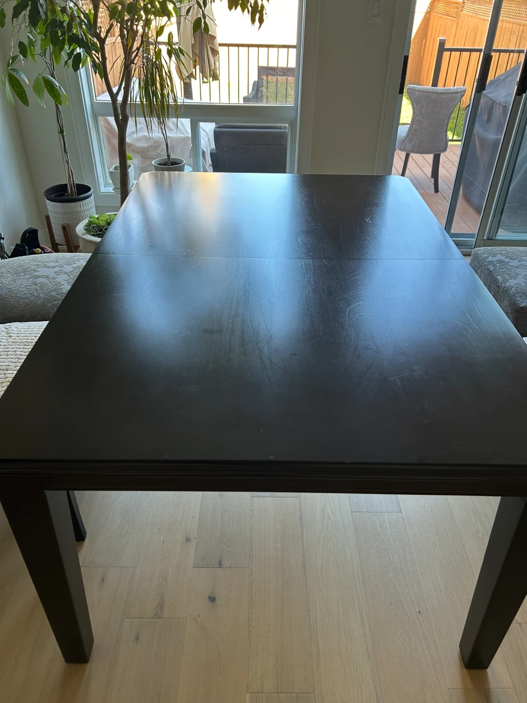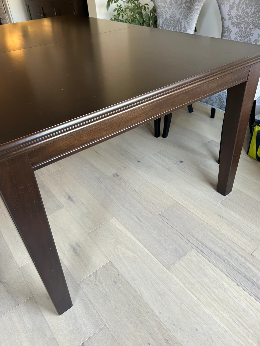 Selling a dark wood custom made dining table. It's in great shape and would be perfect for a dining room or kitchen space. It has a leaf that can be added to extend the table (storage in under table see last pic) Table is solid wood, like New. Was in dining room (was not used for kitchen table) I moved and don't have space it. Pick up Bolton Legs can be removed for transporting