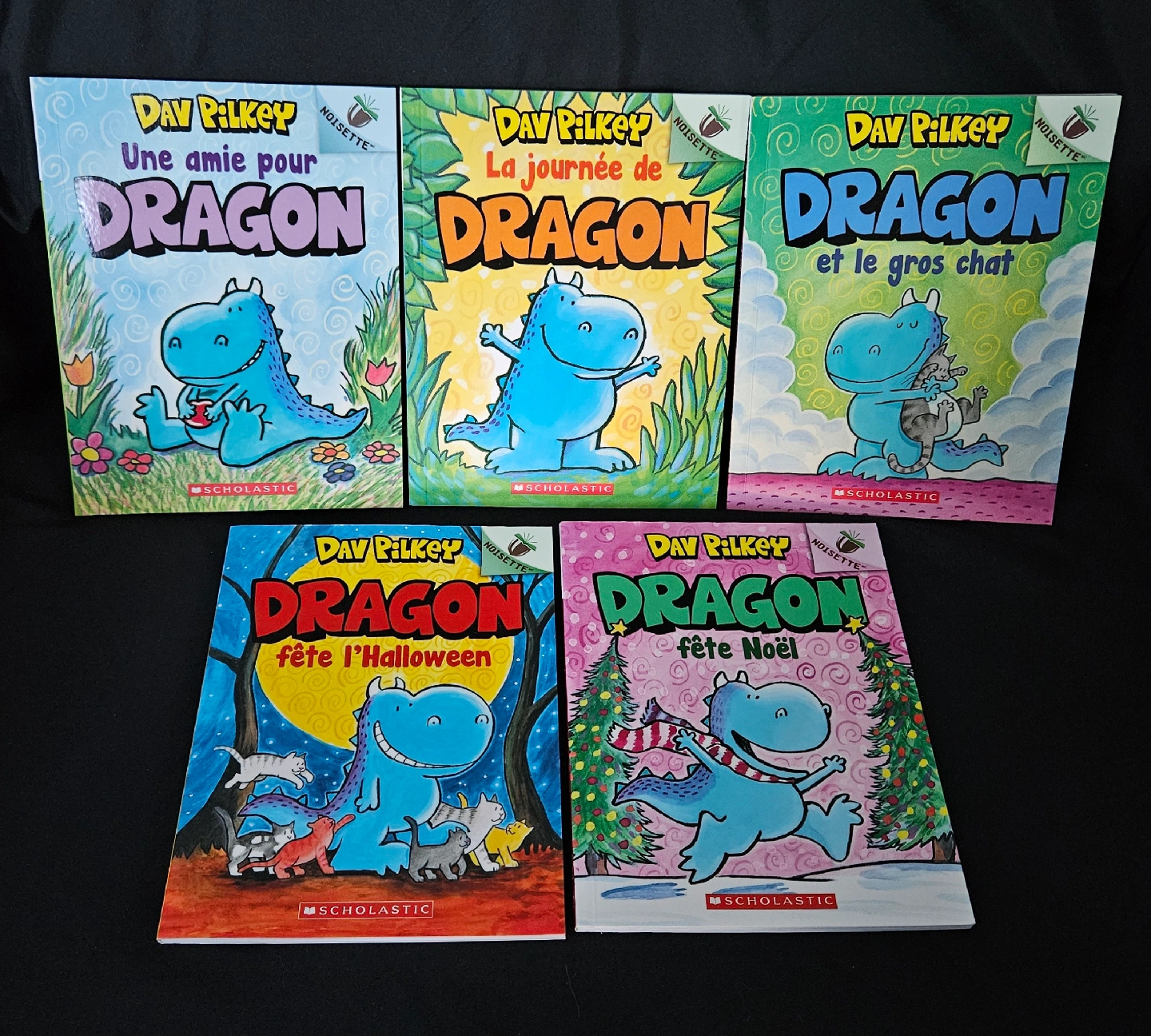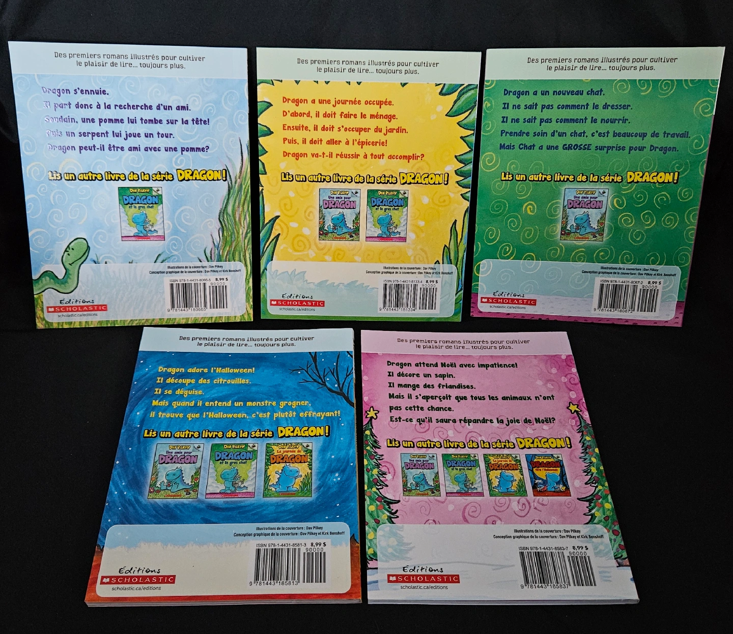 Set of five soft cover French language Dragon books by Dav Pilkey. Titles include: -Une amie pour Dragon -La journée de Dragon -Dragon et le gros chat -Dragon fête l'Halloween -Dragon fête Noël $3 each or all 5 for $12. All are in like new condition.