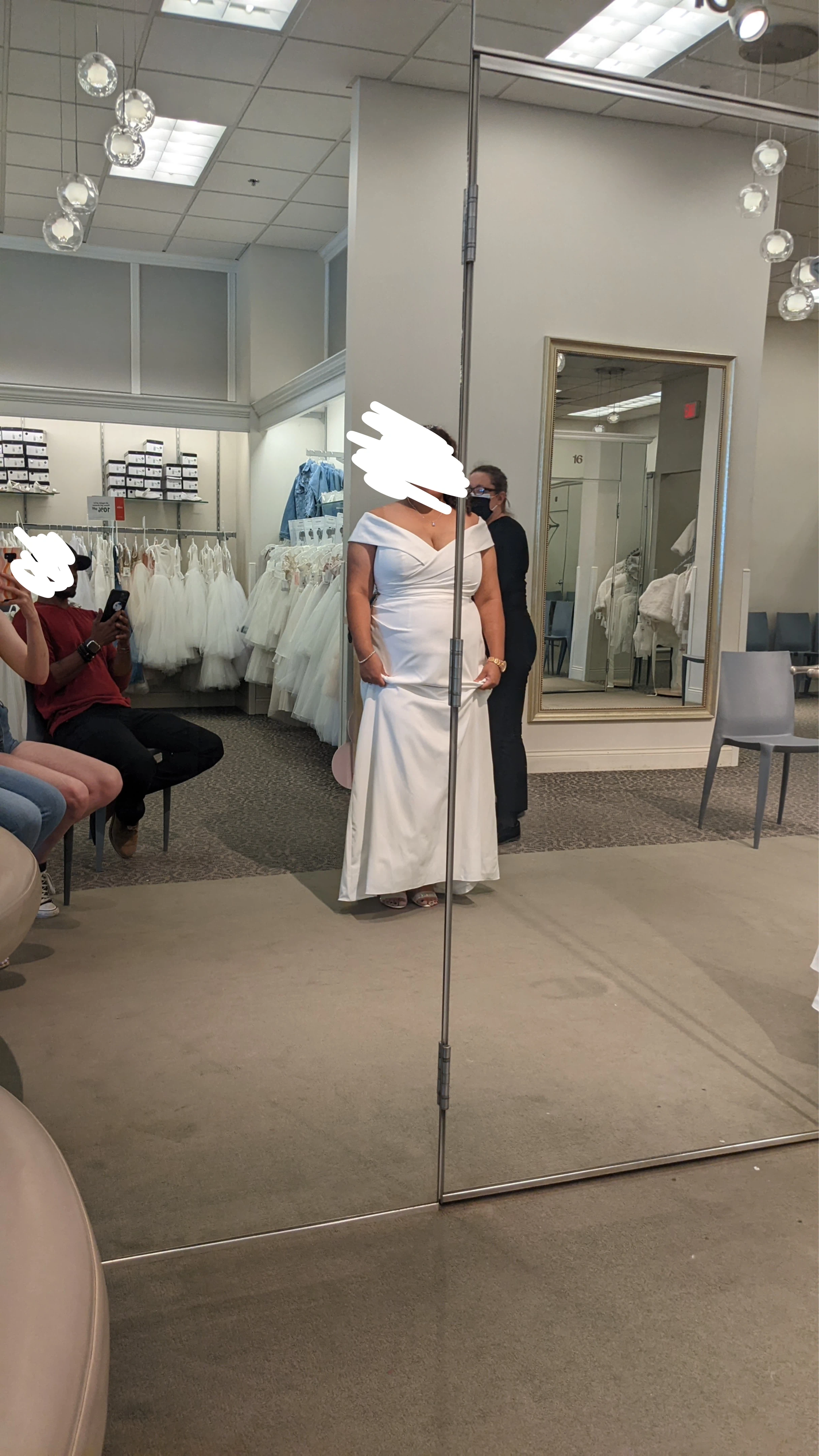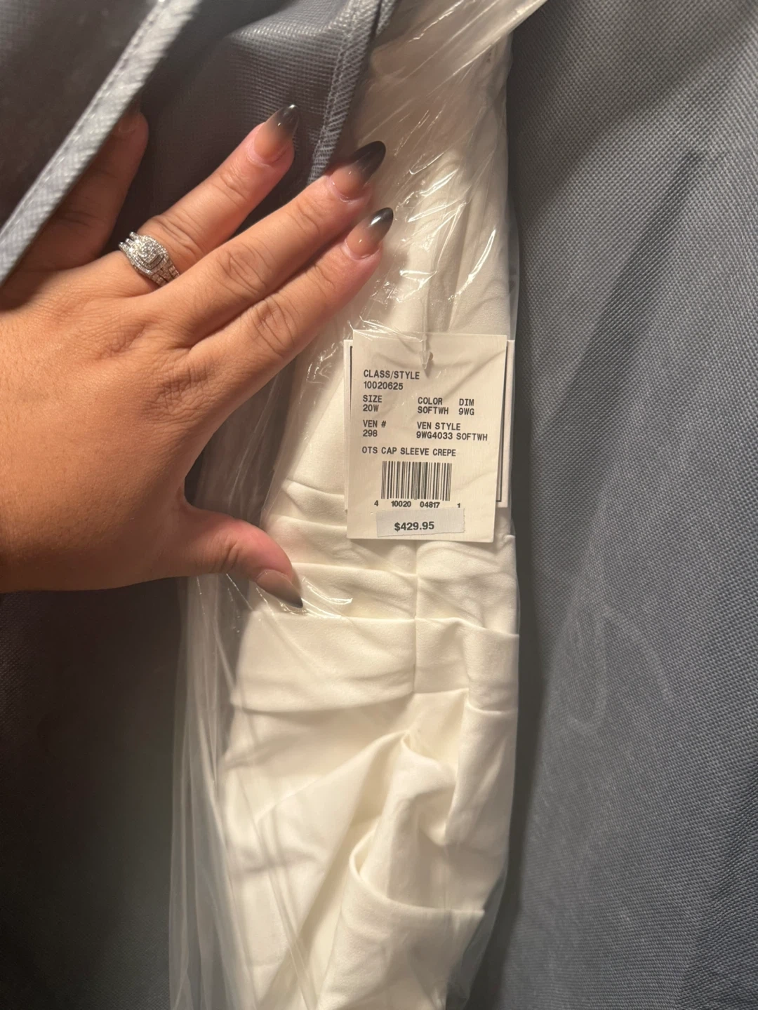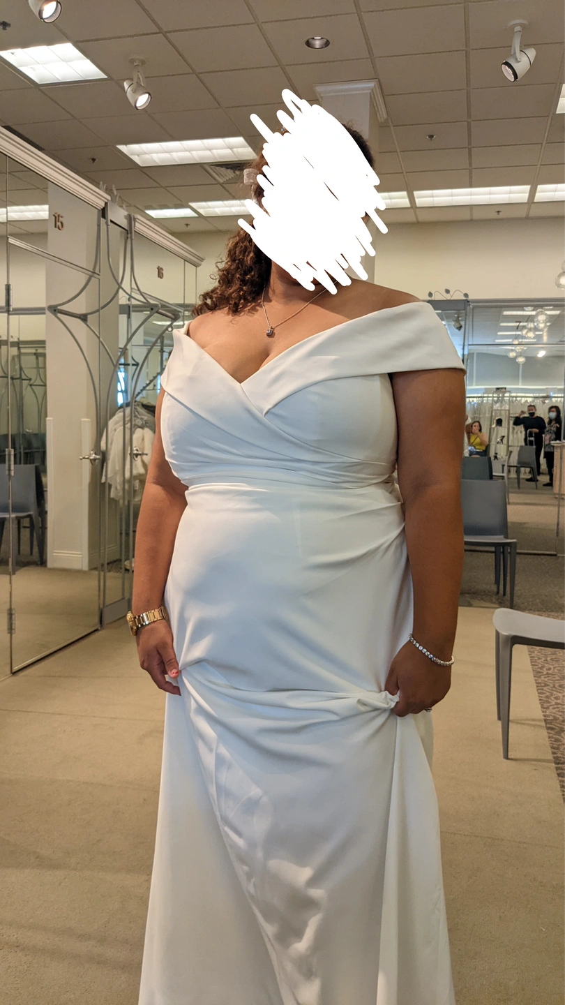 Selling a beautiful David's Bridal wedding dress never worn or altered in size 20W. The dress is a soft white colour and is brand new. The style is OTS Cap Sleeve Crepe. It originally retailed for $429.95. Comes in a David's Bridal garment bag The dress on me in the picture was the show model, I changed my mind and chose a different dress lol the actual dress is still in the plastic and inside garment bag