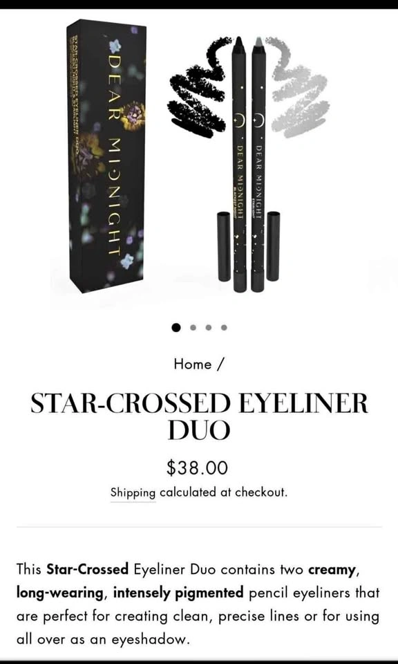 I sell makeup locally on discounted prices. Product Condition: New Product Discription: *Dear Midnight* Star-Crossed Eyeliner Duo ~ Blackest Night & Starlight Product Company Name: Dear Midnight Original Price: $38 My Price: $20 Cruelty Free ✅ Company Website:https://dearmidnightatelier.com/products/star-crossed-eyeliner-duo