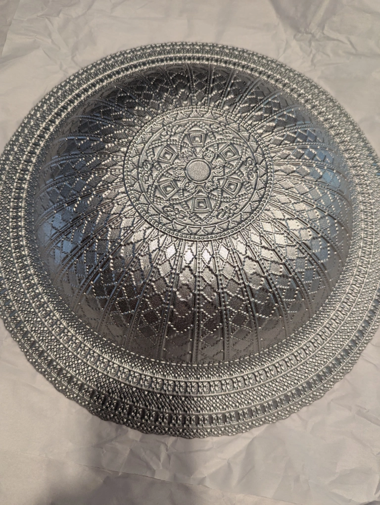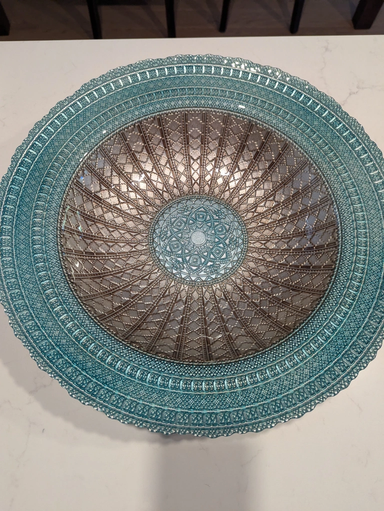 Selling a decorative bowl, perfect for adding a touch of elegance to any room. It's approximately 16 inches in diameter and features a beautiful intricate design. The bowl is in great condition and ready to find a new home!