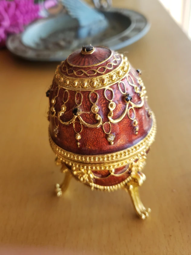 This is a beautiful decorative egg trinket box. It features a rich, reddish-brown colour with intricate gold detailing and small black accents. It stands on three ornate gold legs, adding to its elegant appearance. Perfect for storing small treasures or as a lovely display piece! plays music too!