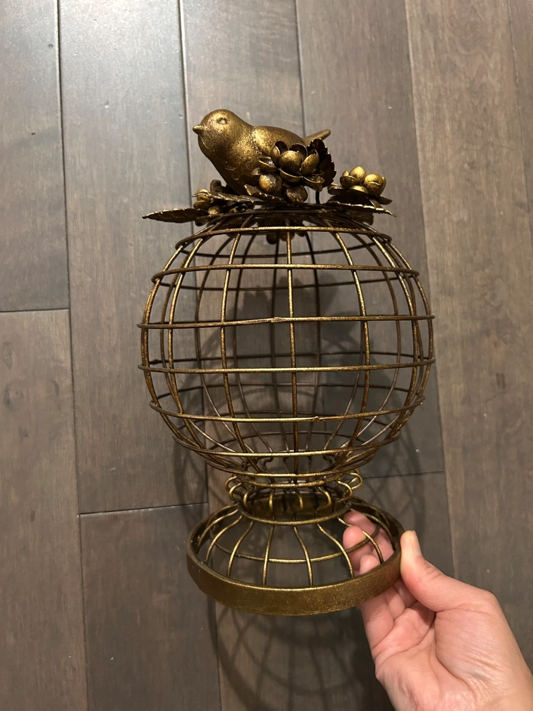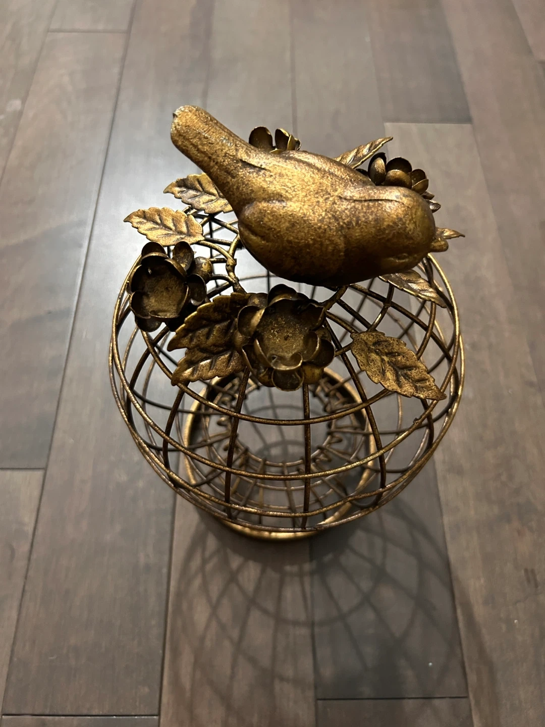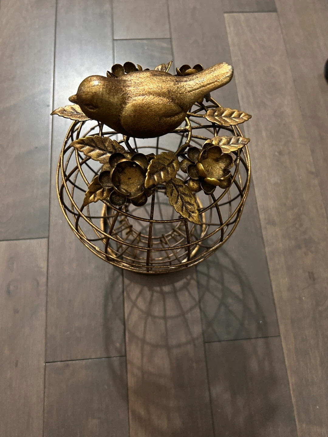Selling a decorative gold bird cage. It's in great condition and would look lovely in any room! It features a bird perched on top of a spherical cage with floral accents. A unique piece to add some charm to your home decor