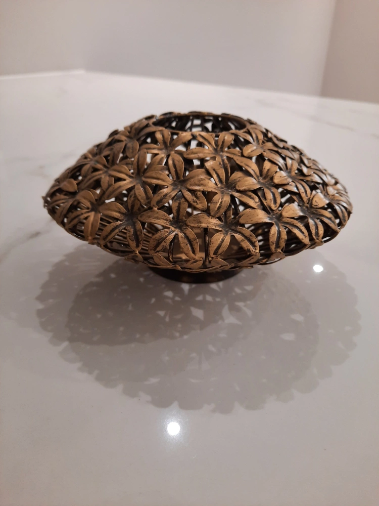 This is a decorative metal bowl with a flower design. It's perfect for adding a touch of elegance to any room. It is in great condition and ready for a new home
