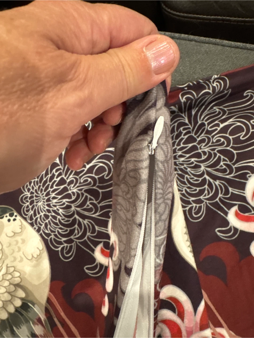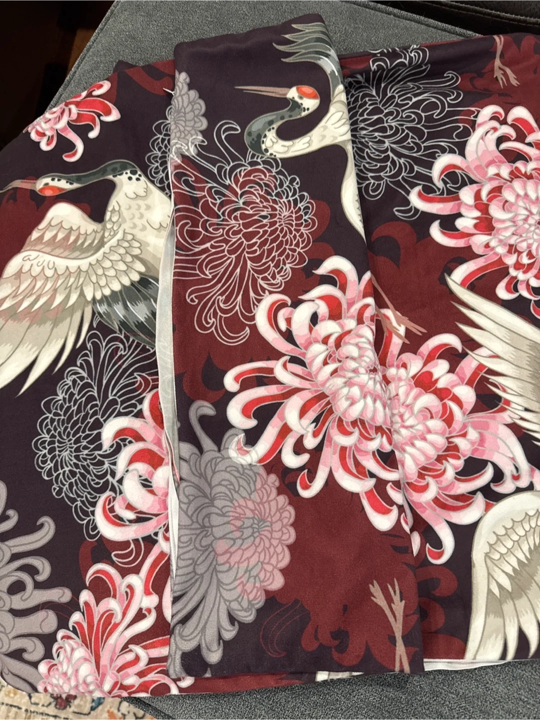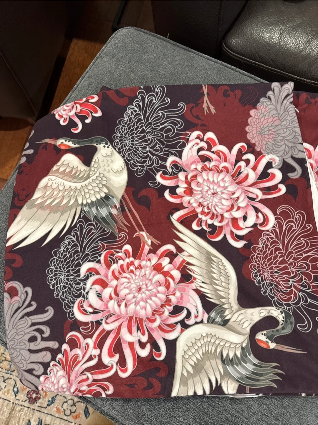 A pair of vibrant coloured pillow covers. Featuring a lovely floral and crane design in rich burgundy and grey tones on BOTH sides. Soft velvety feel. The cover has a convenient hidden zipper closure for easy insertion and removal of your pillow. Both zippers working. It's in great condition and ready for a new home! Can be machine washed and placed in dryer. Measures 19x19 inches and will easily fit a 18x18 insert for a looser fit or a 20x20 cushion for a tighter fit.