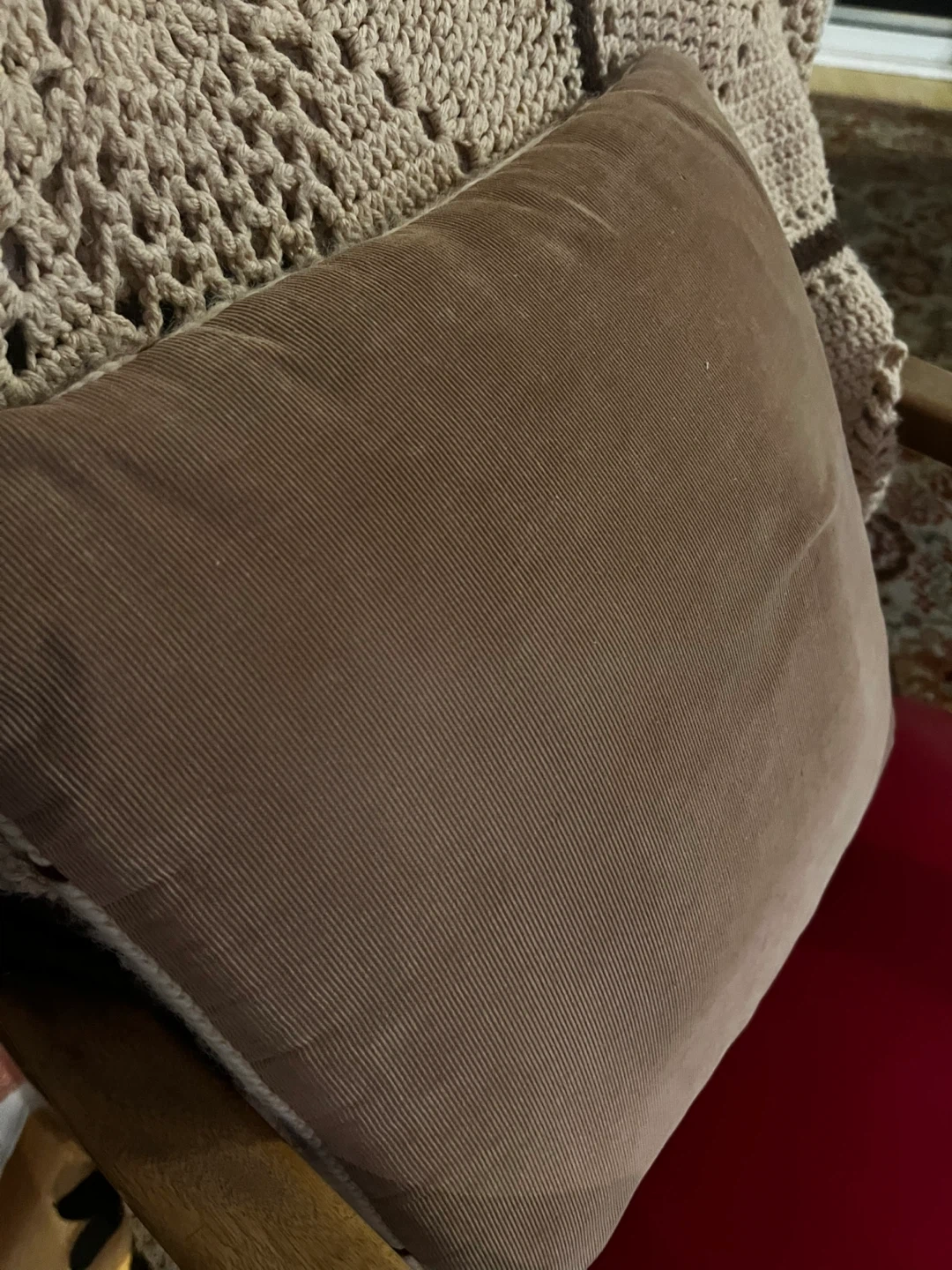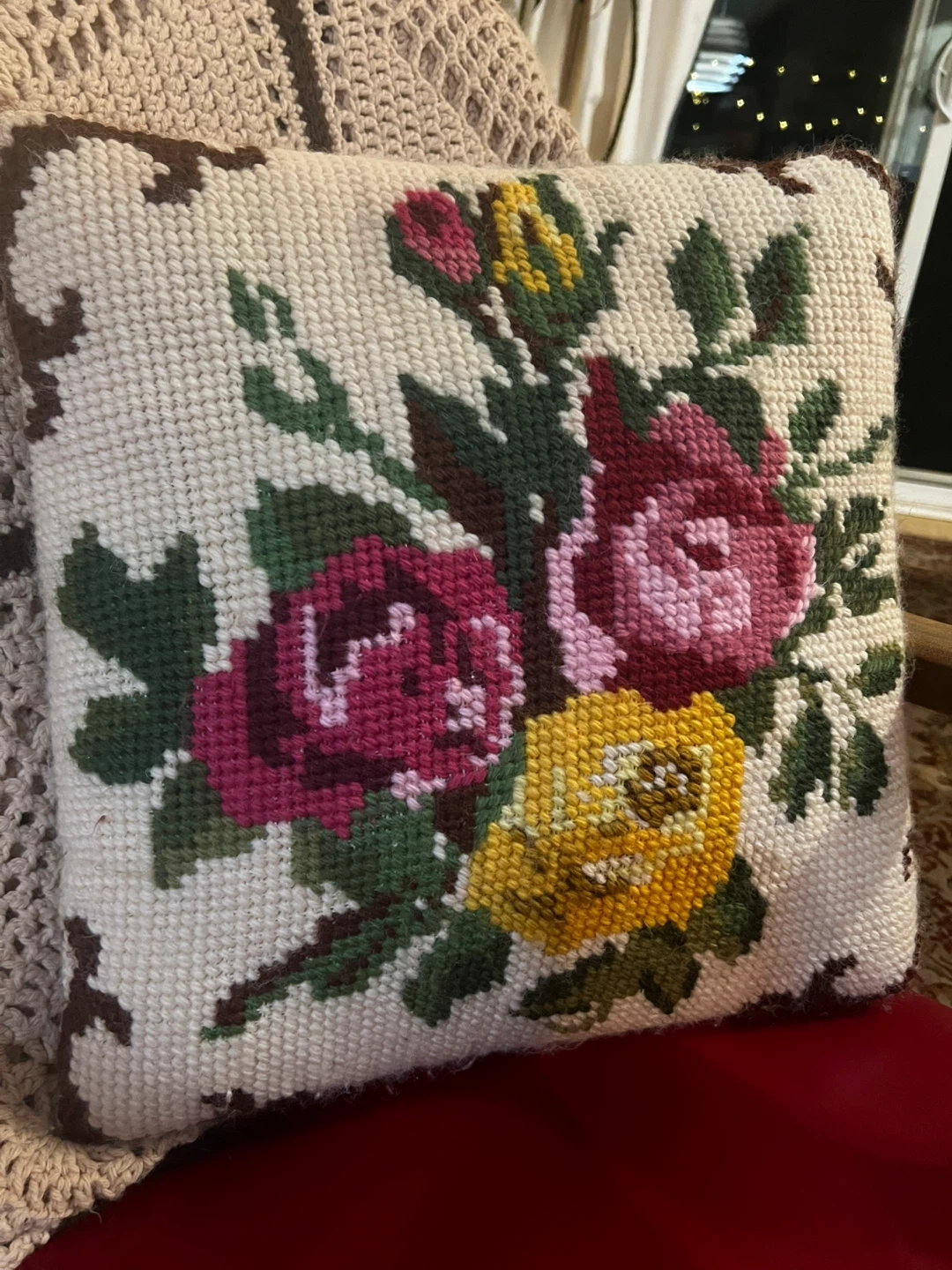 Here's a decorative needle point 16inch throw pillow with a floral design on one side and a corduroy texture on the other. It would be a lovely addition to any living space!