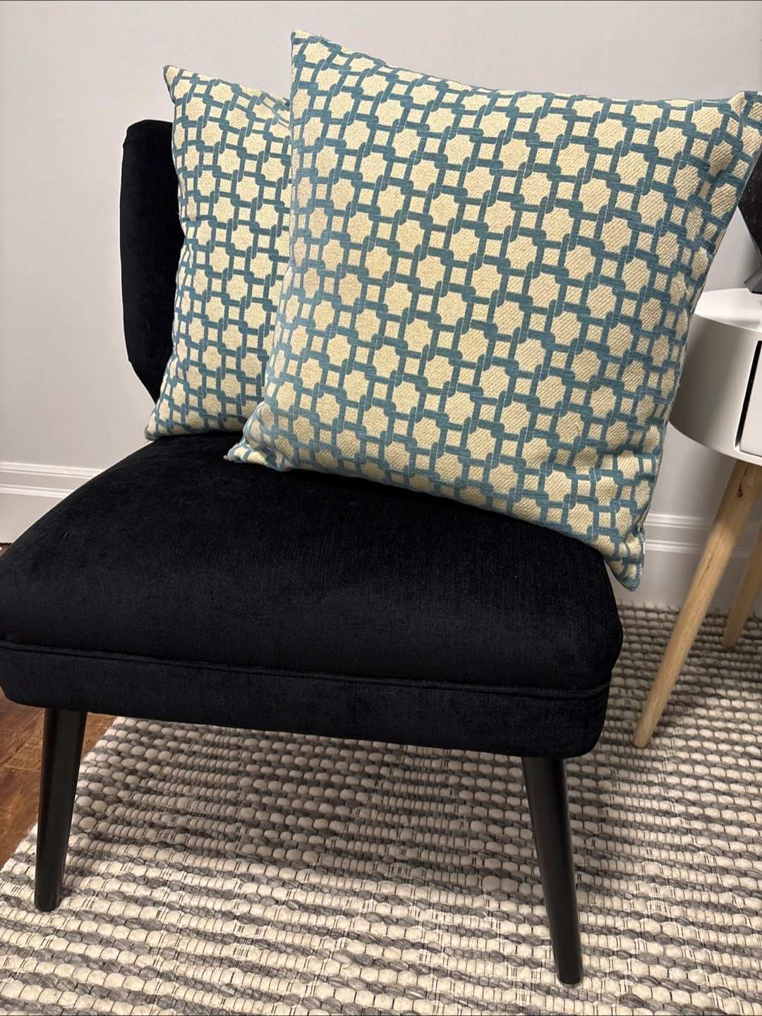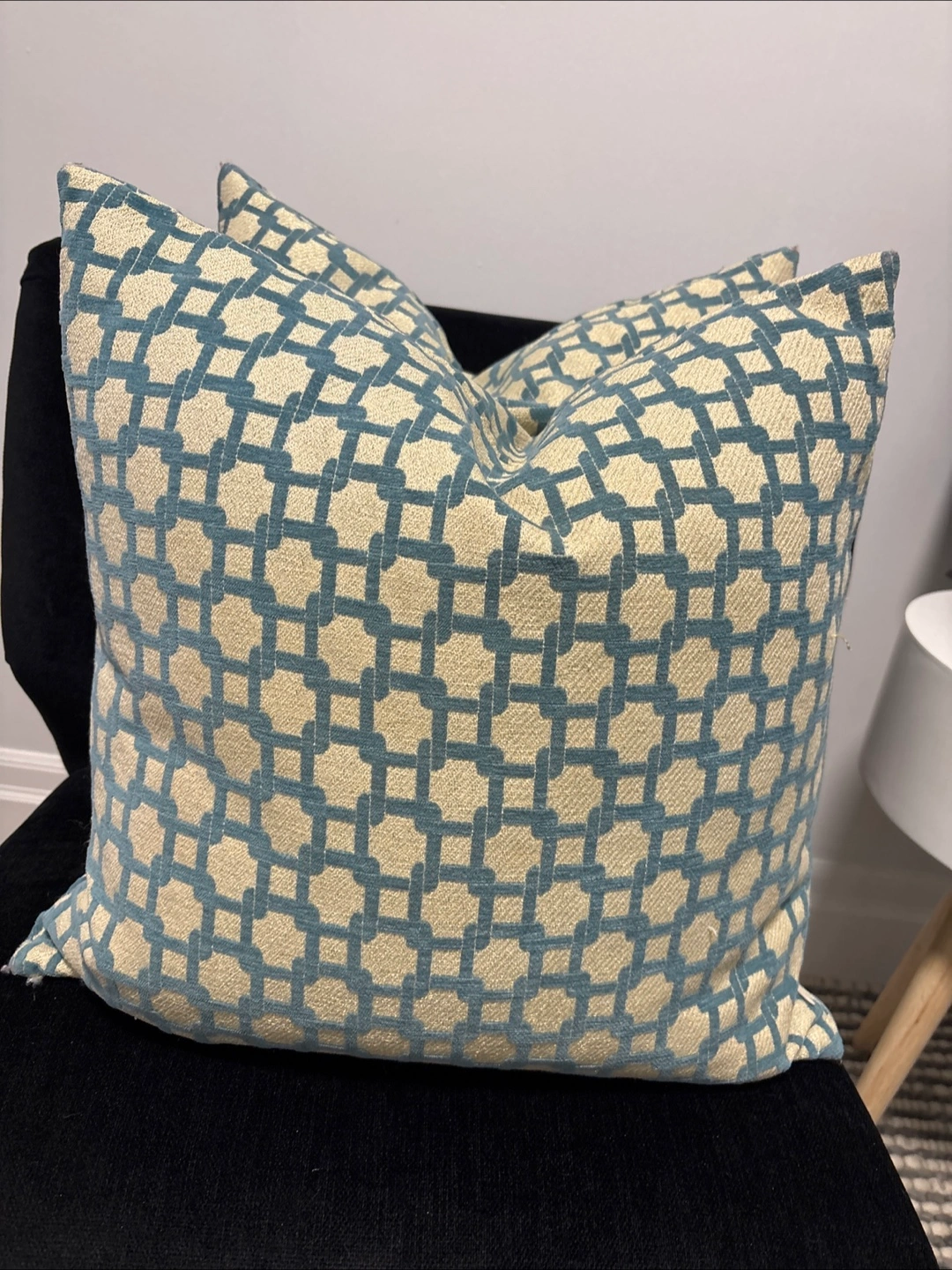 Two lovely throw pillows with a unique blue geometric pattern. Down filled. They're in great shape and would add a nice touch to any living room or bedroom! The material feels soft and durable, perfect for adding a bit of comfort and style to your space $25 for the pair. Firm price. No holds. Pick up only