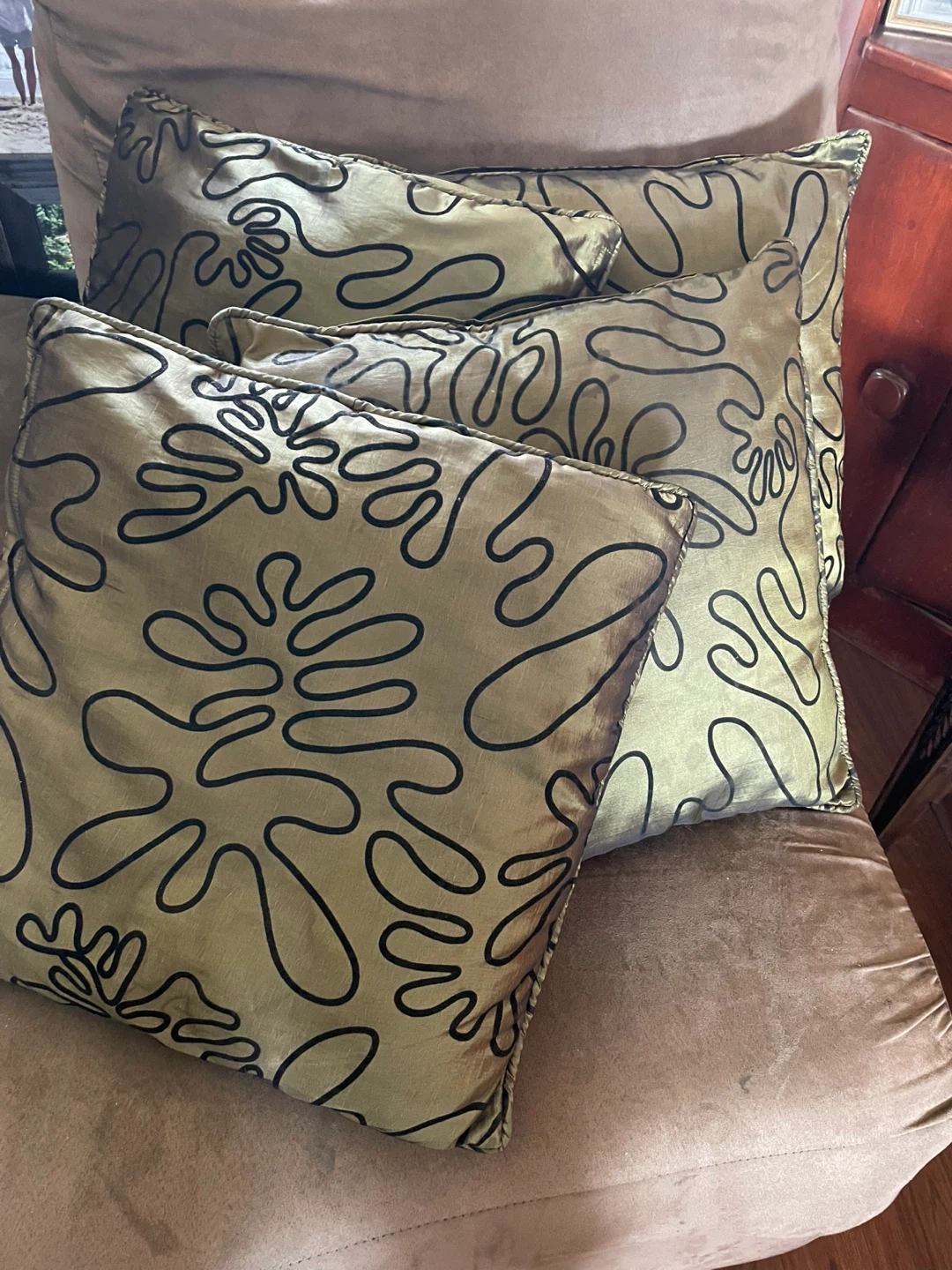Selling a set of 4 decorative throw pillows. They feature a unique design and would look great in any living space. The pillows are in good condition from a non smoking and no pets .. no stains , no rips/holes