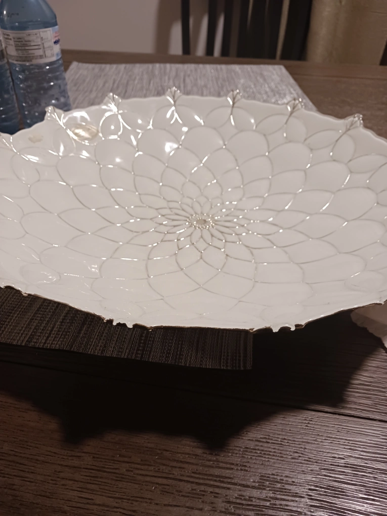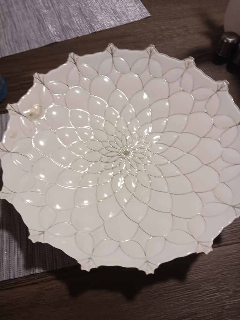 Selling a decorative white bowl with a unique floral pattern. It's in great condition and would look lovely as a centrepiece or accent piece in your home