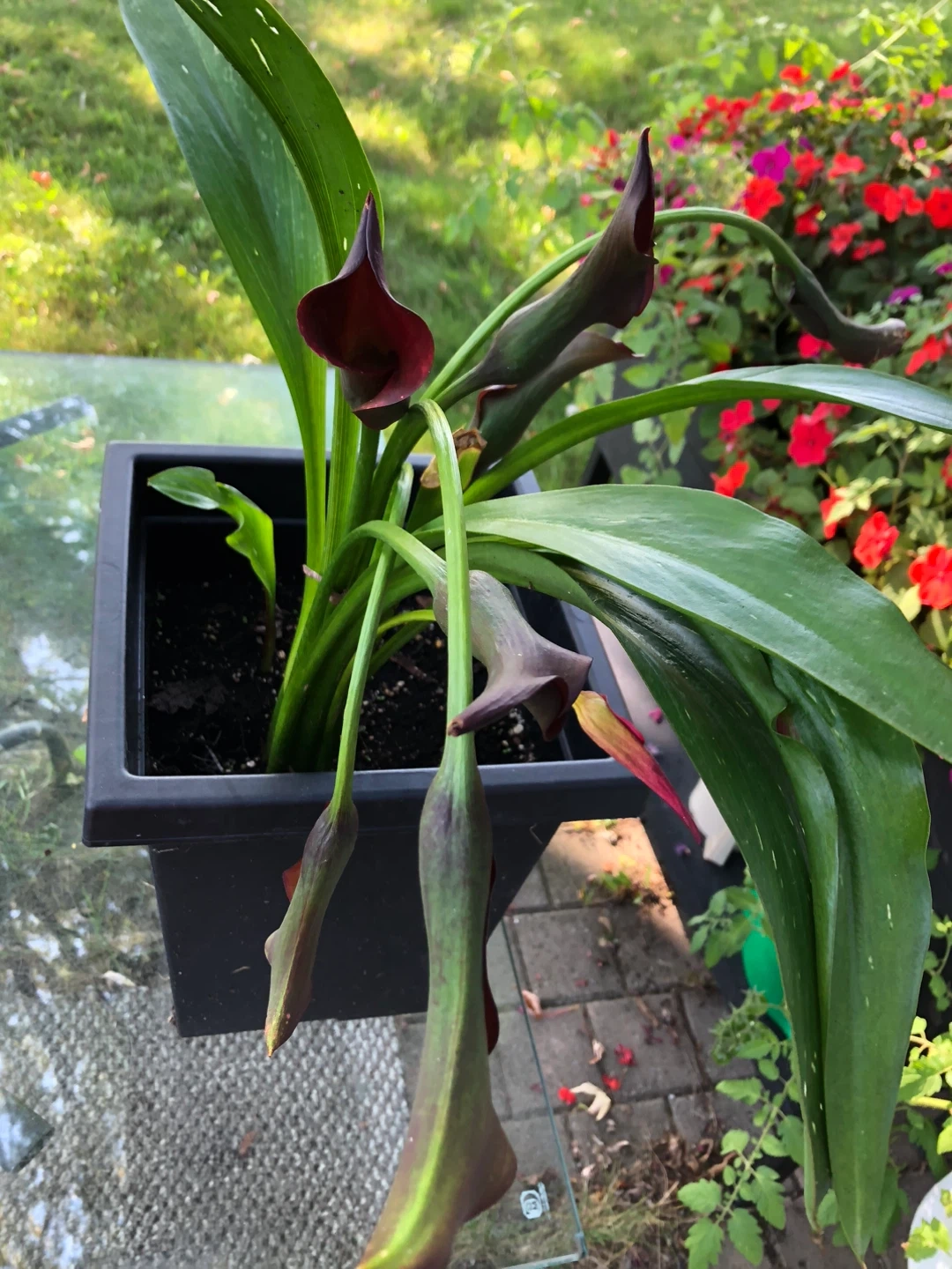 I have a beautiful calla lily plant for sale. It has been outside in a shady area blooming continuously all summer. As it is a tropical houseplant, it is time to bring it inside. Some people describe the flowers as dark purple, but to my eye, they are dark red black.The flowers bloom for a long time and add a touch of elegance. They should be transplanted into an indoor pot.