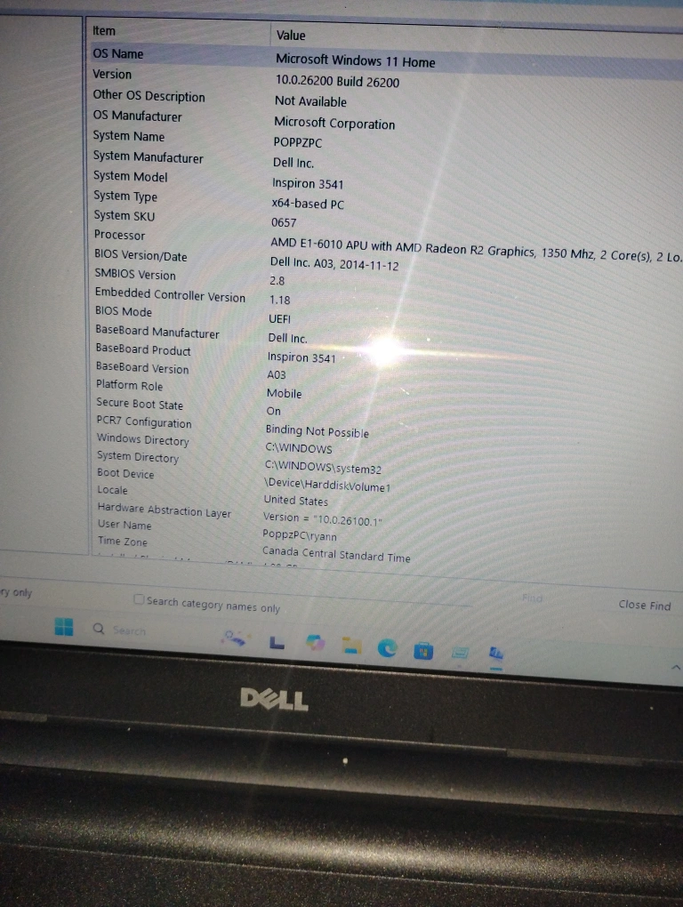 Selling a Dell Inspiron 3541 laptop. MISSING BATTERY. It's running Microsoft Windows 11 Home, version 10.0.26200 Build 26200. The system model is a Dell Inc. Inspiron 3541, with system SKU 0657. It has an AMD E1-6010 APU with AMD Radeon R2 Graphics, 1350 Mhz, 2 Core(s). 4 gigs ram, 4 gigs vram, 500 gig HDD.