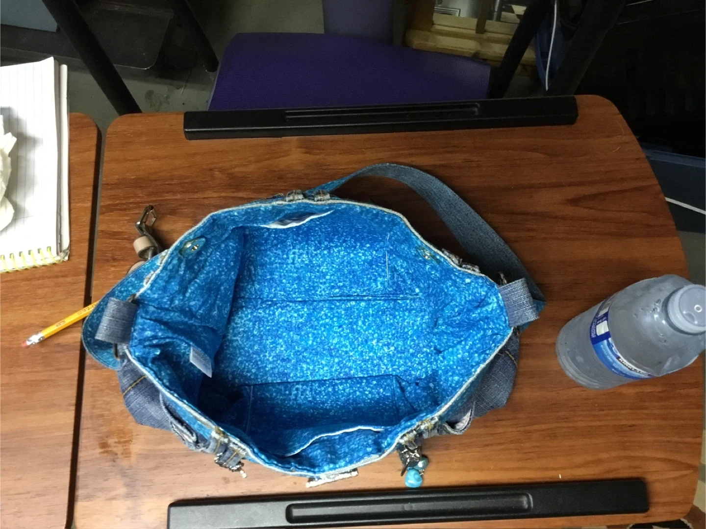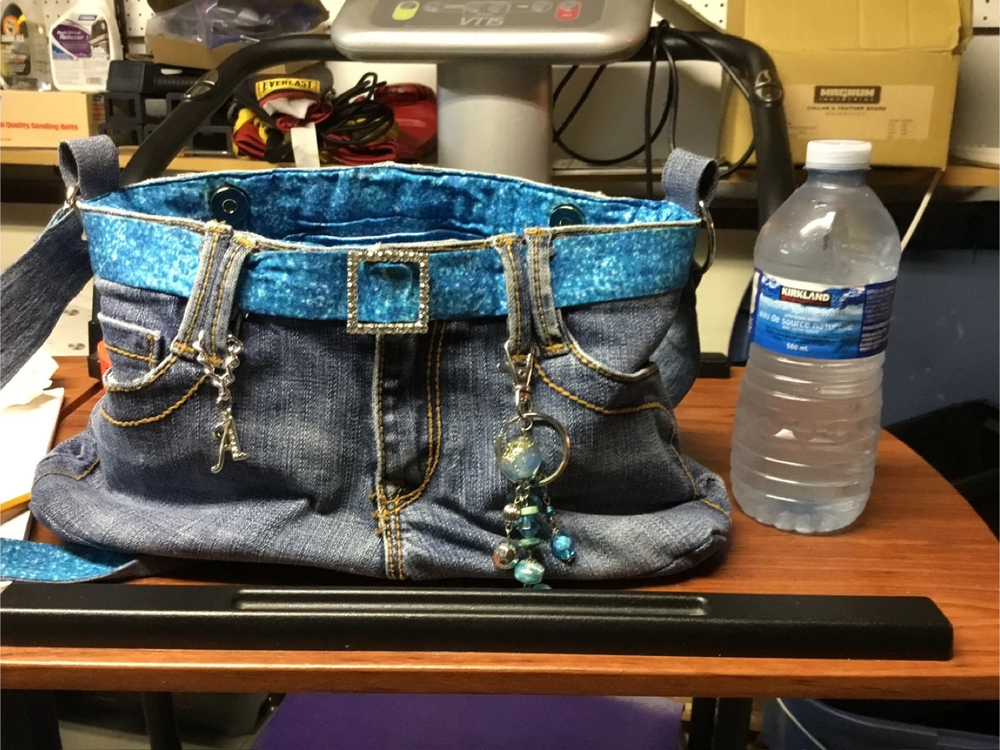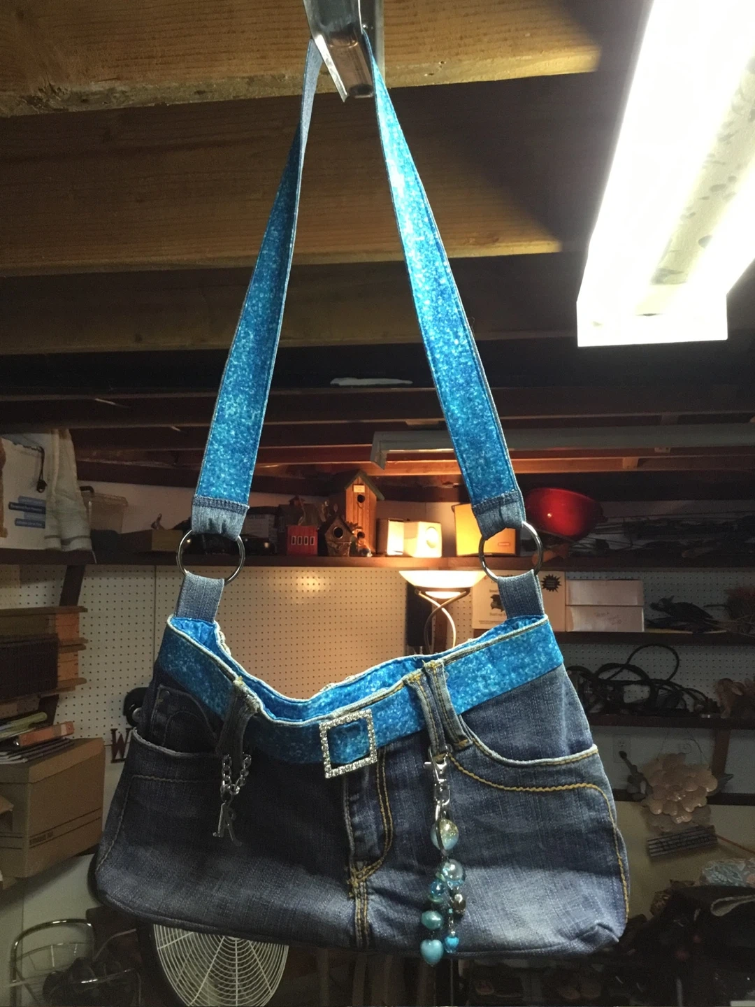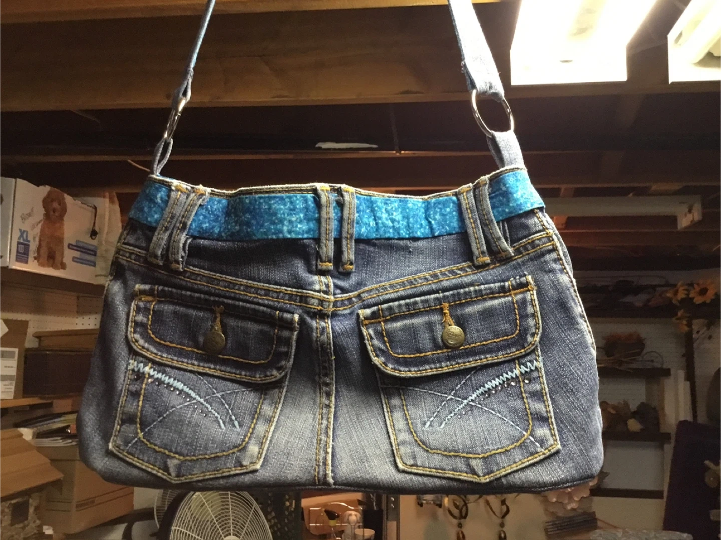 Check out this unique denim shoulder bag! It's got a really cool design, almost like it's made from repurposed jeans. The inside is lined with a bright blue patterned fabric. It's a fun and eye-catching piece!