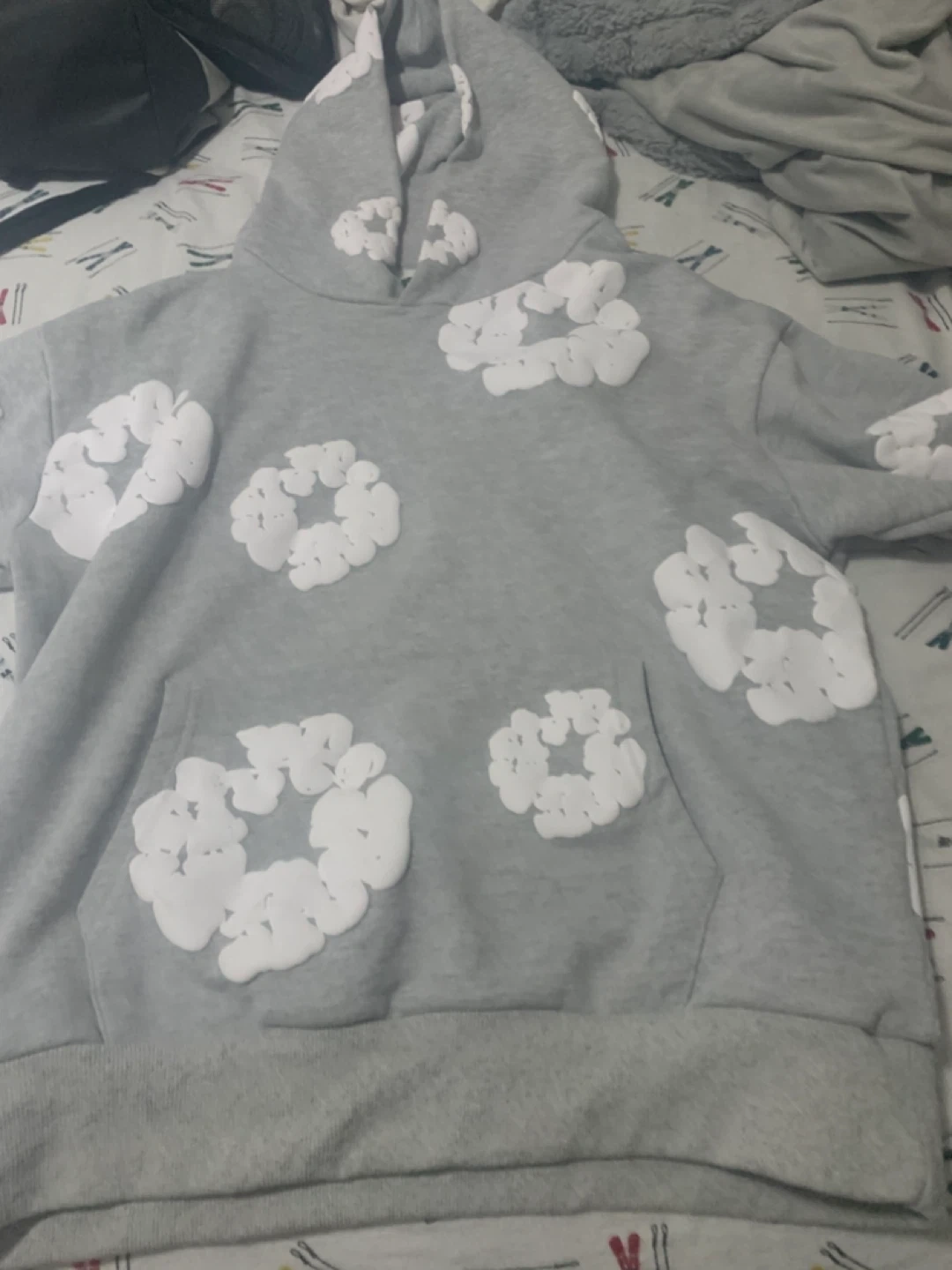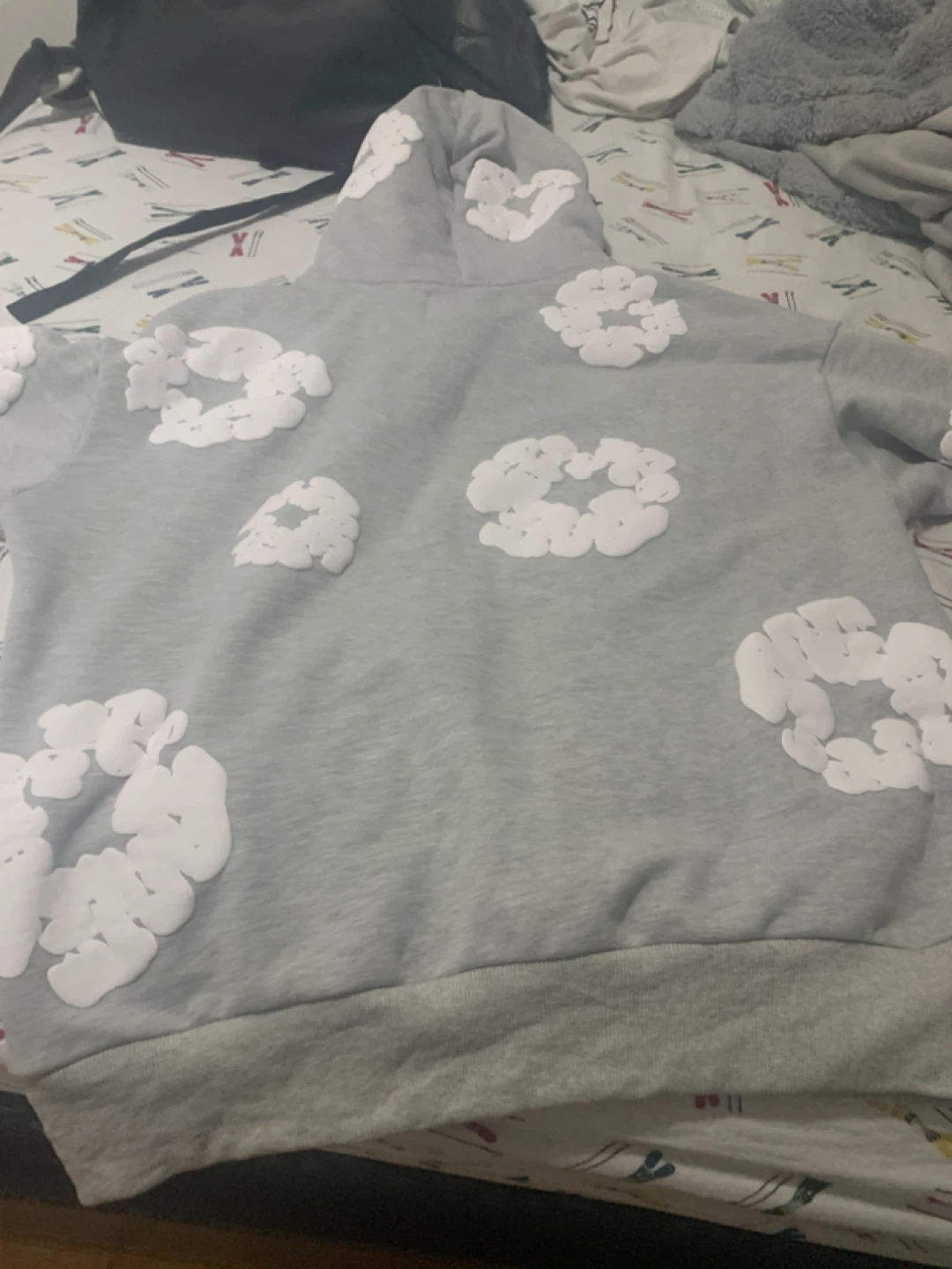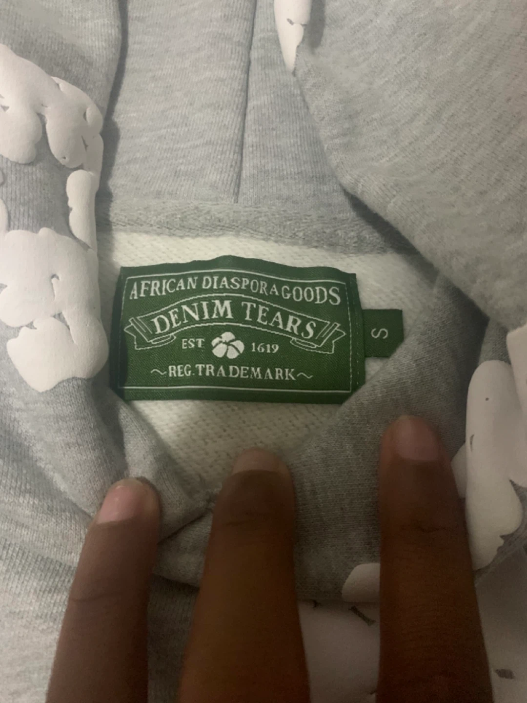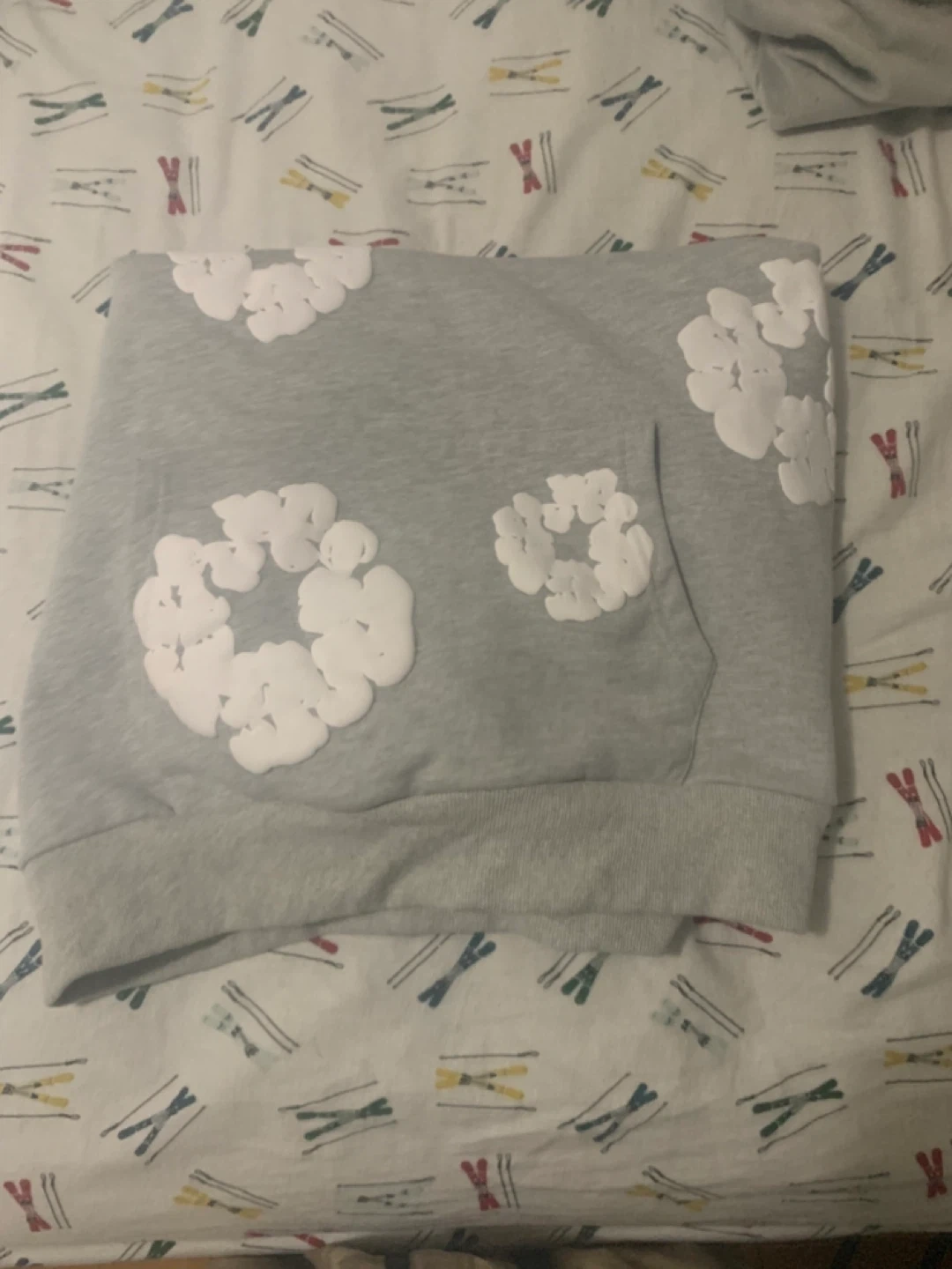 Selling a Denim Tears hoodie in size small! It's a light grey colour with white floral designs. This hoodie is in great condition and ready for a new home