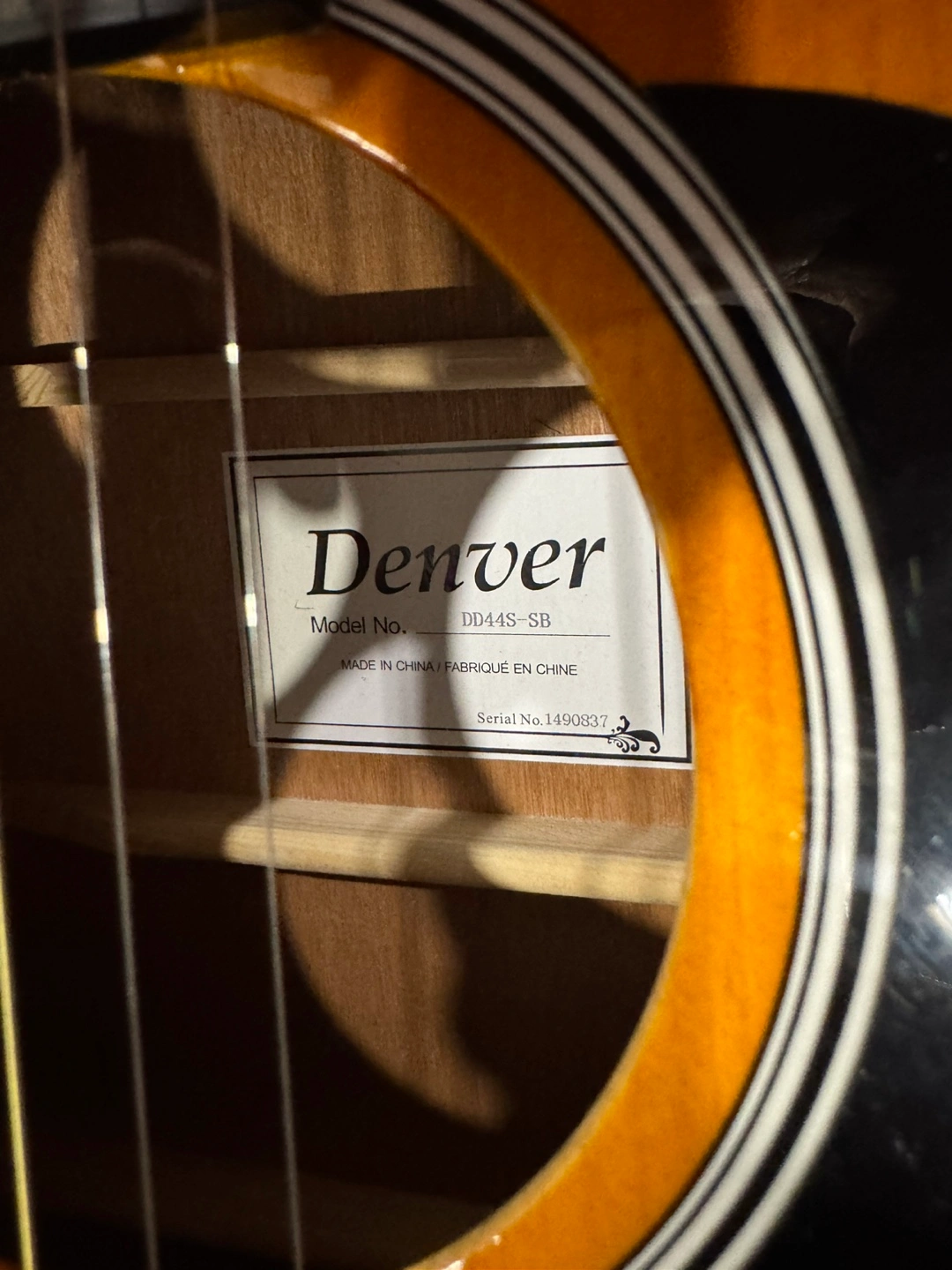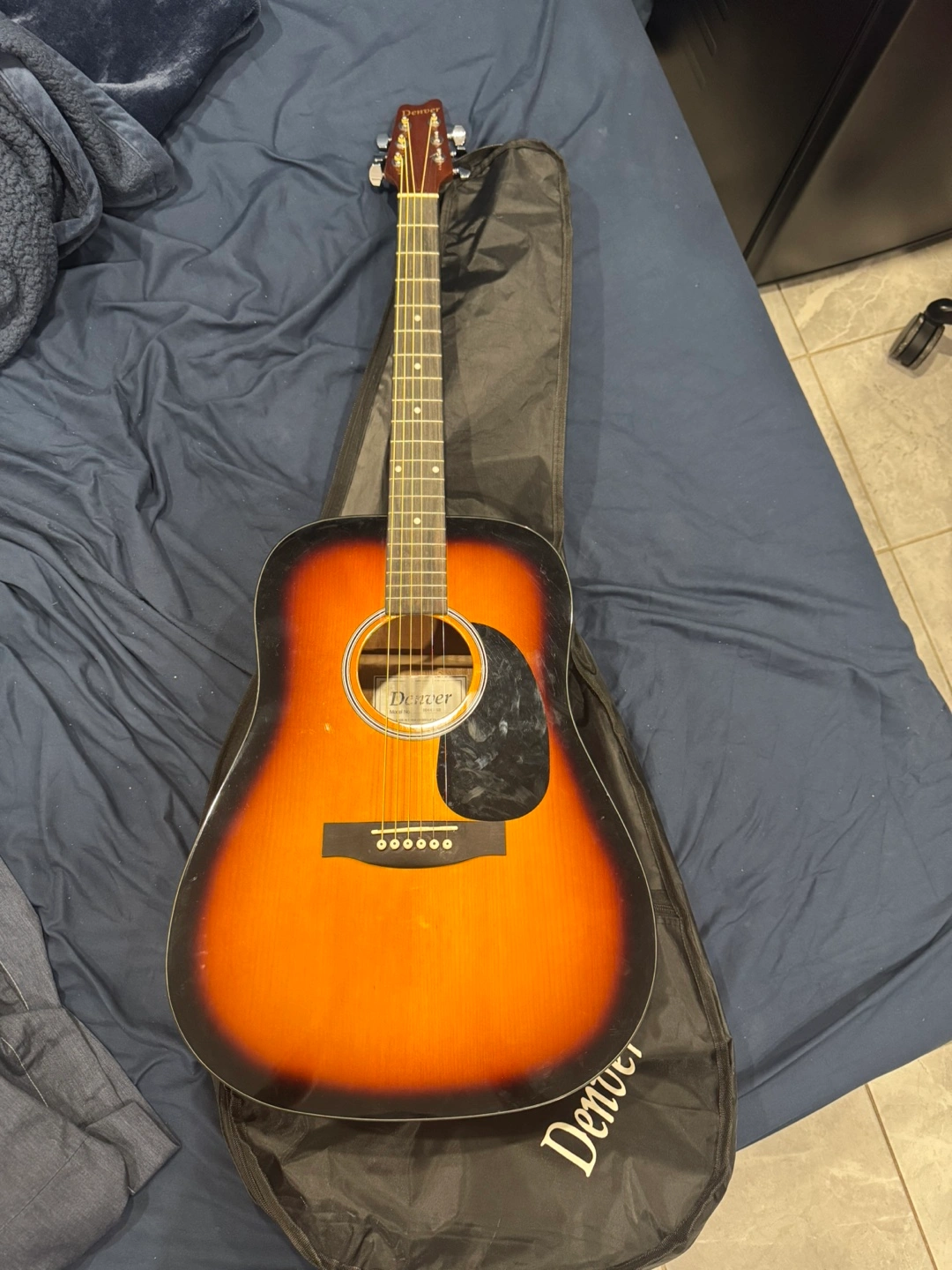 Selling a Denver acoustic guitar in good condition. It comes with a gig bag for easy transport and storage. Perfect for beginners or anyone looking for a reliable acoustic guitar!