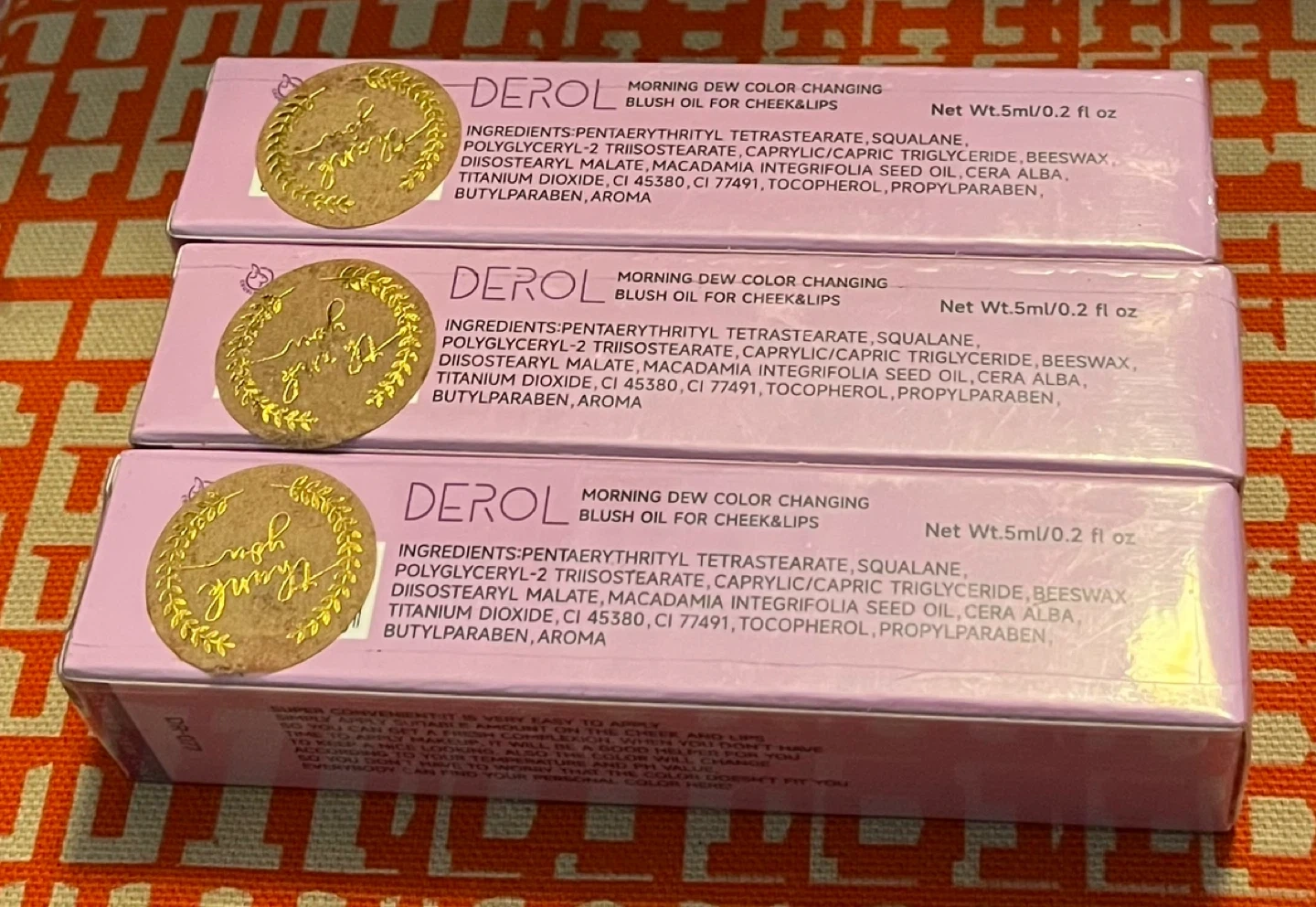 Here are three brand new DEROL Morning Dew Color Changing Blush Oils for your cheeks and lips! They're blush oils that change colour with temperature and different pH values. - Natural shine - Net Wt. 5ml/0.2 fl oz - Expiry Date: 2028 March 19 $5 each