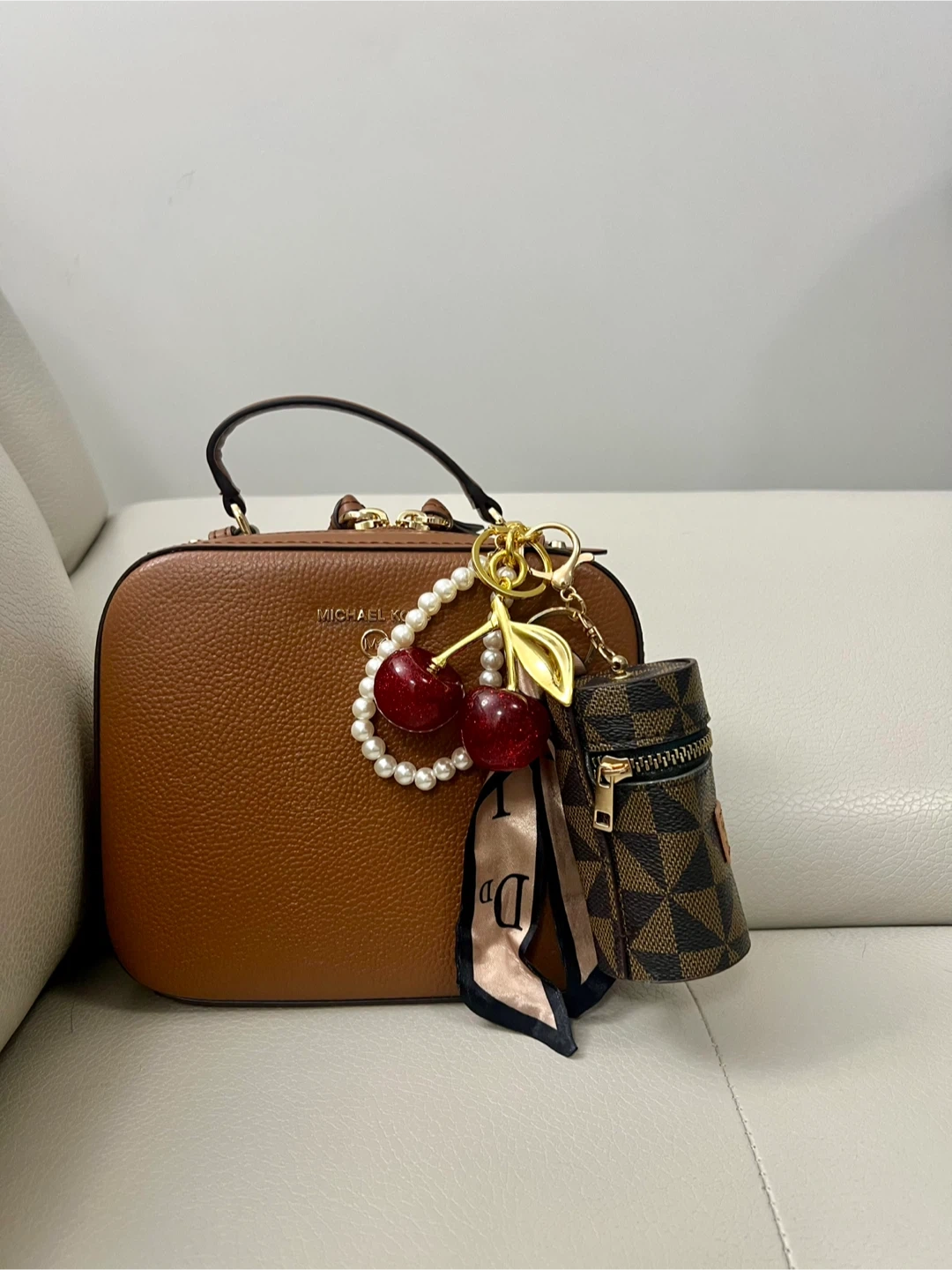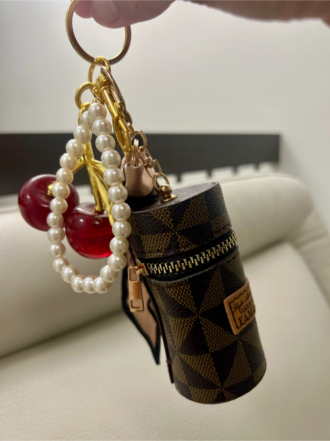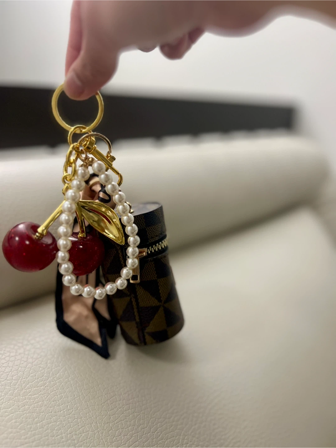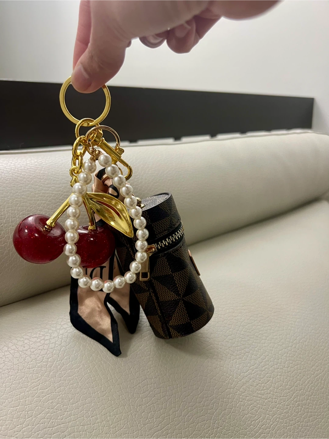 Super cute keychain featuring cherry charms, pearl accents, and a mini pouch with a designer-inspired pattern! Adds a touch of fun and style to your keys or bag. The pouch could be used for small items like lip balm or coins. Perfect for adding a bit of personality to your everyday carry!