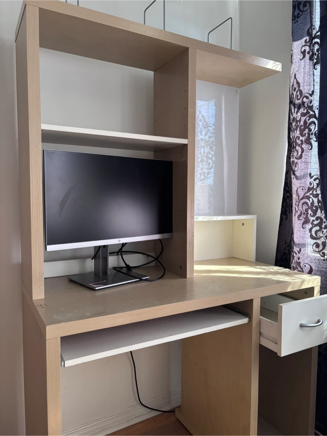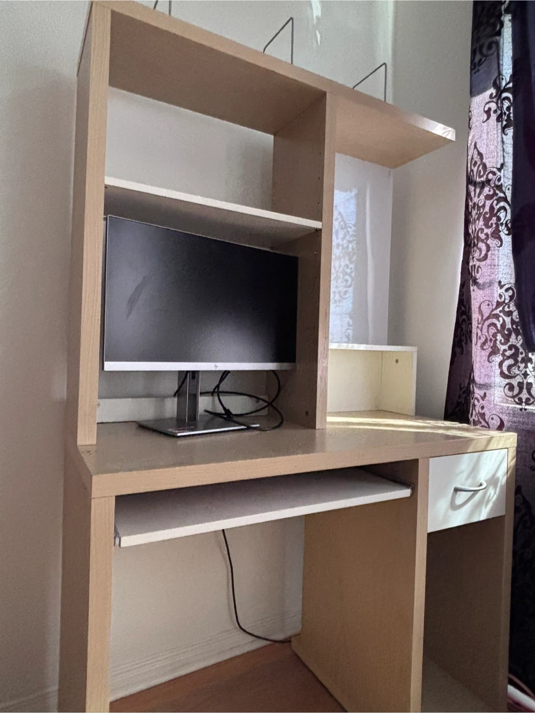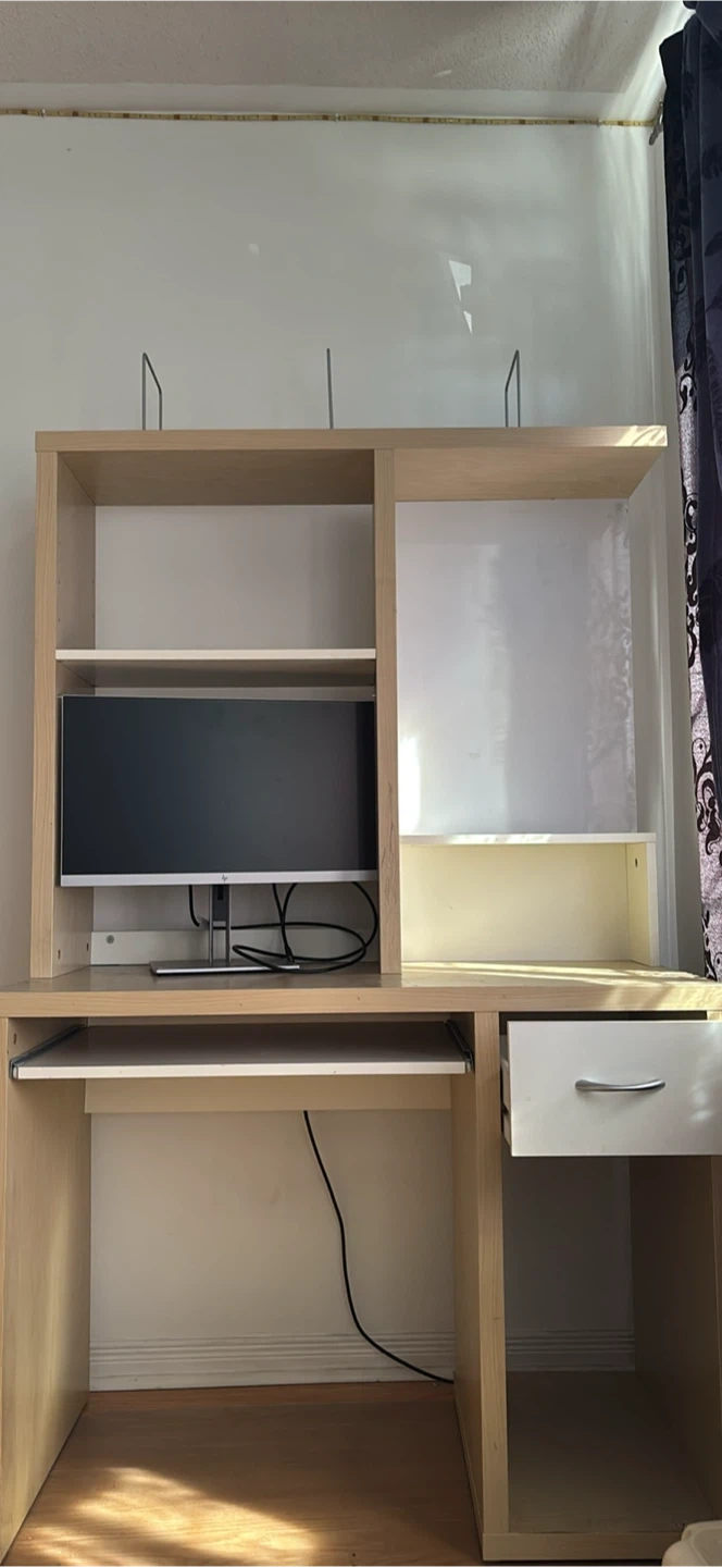 Selling my used desk for $40. Features a mini bookshelf on top, magnetic board, plenty of space, storage drawer, and pull-out keyboard tray. Great for home offices, studying, or gaming. Sturdy and functional. You can adjust the height of the middle shelf, and the shelf width on top. Had a few scratches/stains but overall in good shape. Monitor not included!