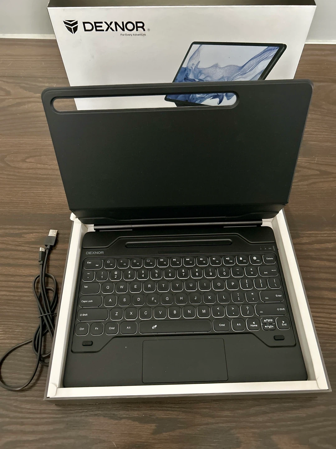 Selling a Dexnor keyboard case, compatible with Samsung Galaxy Tab S9+, S9 FE+, S8+, S7+, and S7 FE models. It features a magnetic floating cantilever design and 7 solid colour backlit keys. Also includes a precise multi-touch trackpad and ultra-long standby time of over 1500 hours. Comes with the original box!