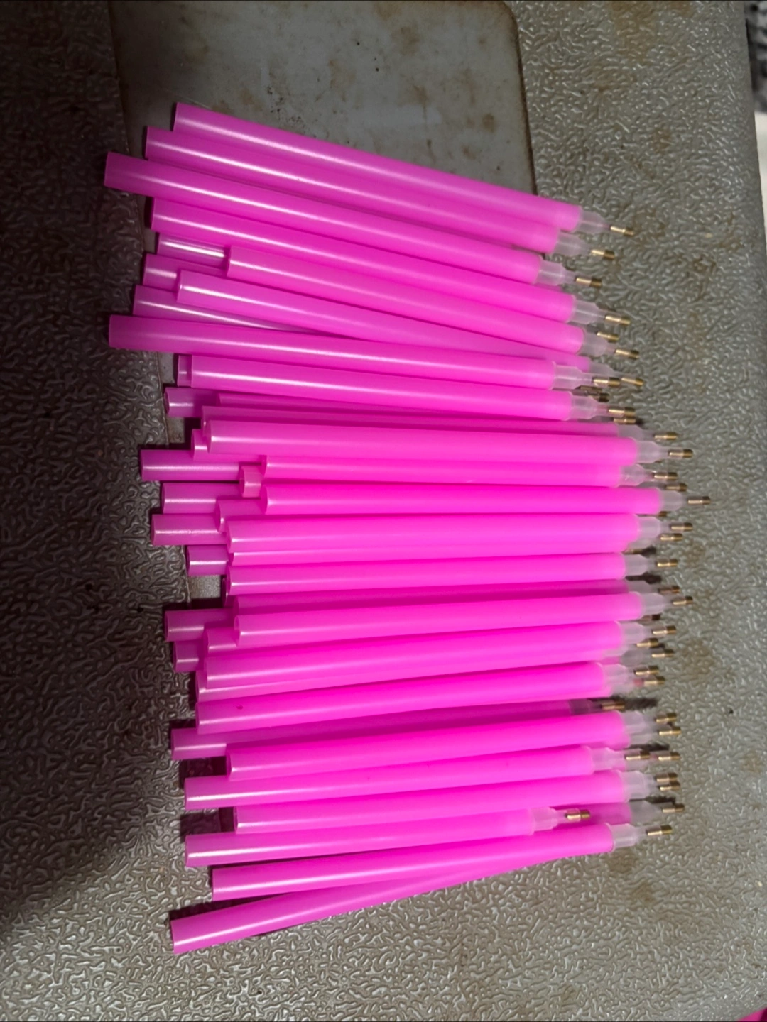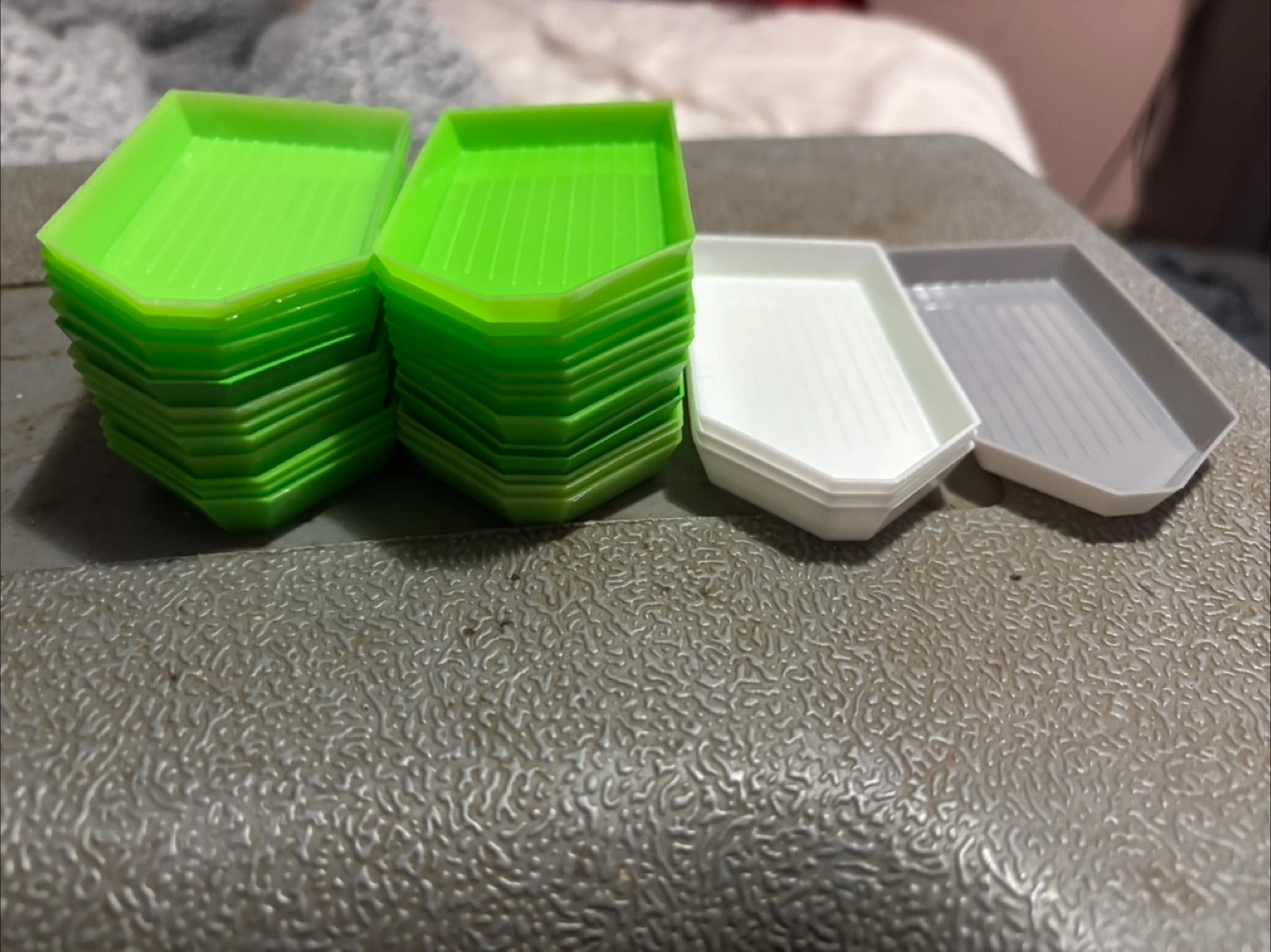 Here's a set of diamond painting tools! Included are pink pens and trays in green, white, and grey. Perfect for all your diamond art projects