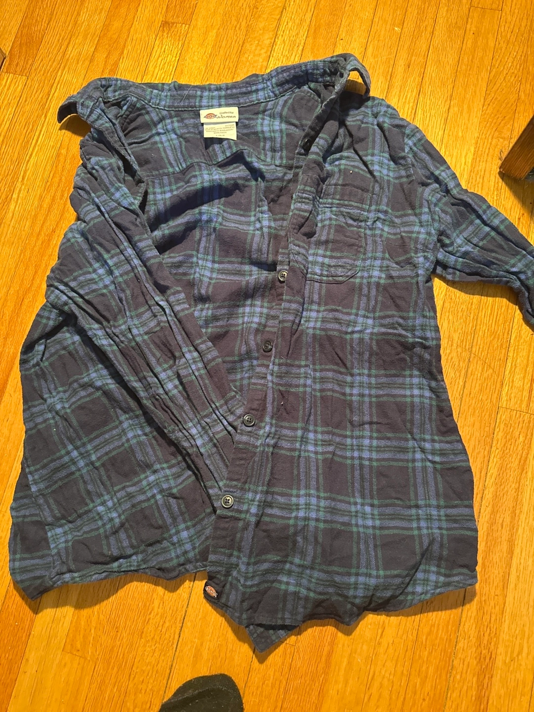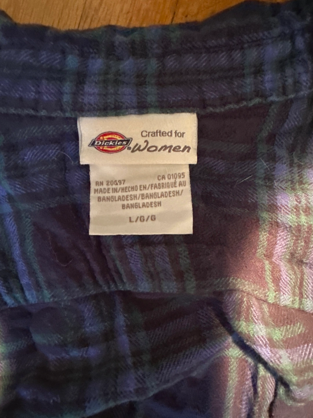 Cozy Dickies flannel shirt for women in size L! This shirt features a classic plaid pattern in shades of blue and green. It's crafted for women and perfect for layering or wearing on its own. It's in great condition and ready for a new home