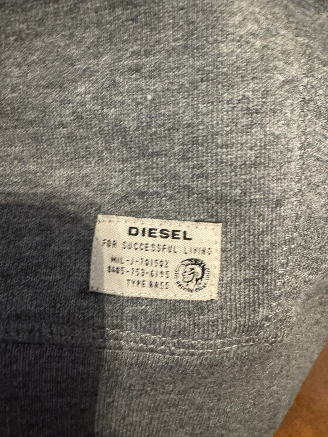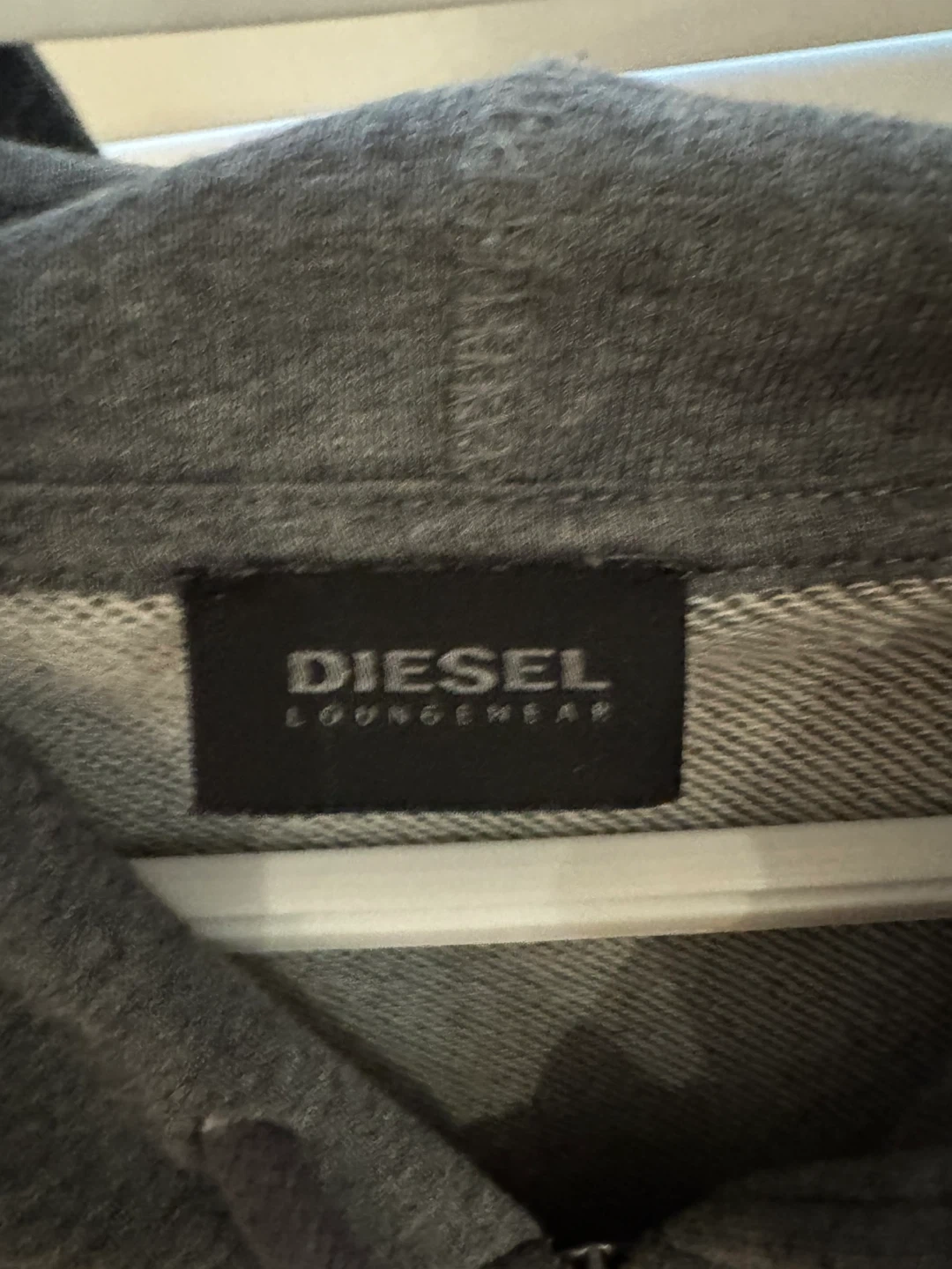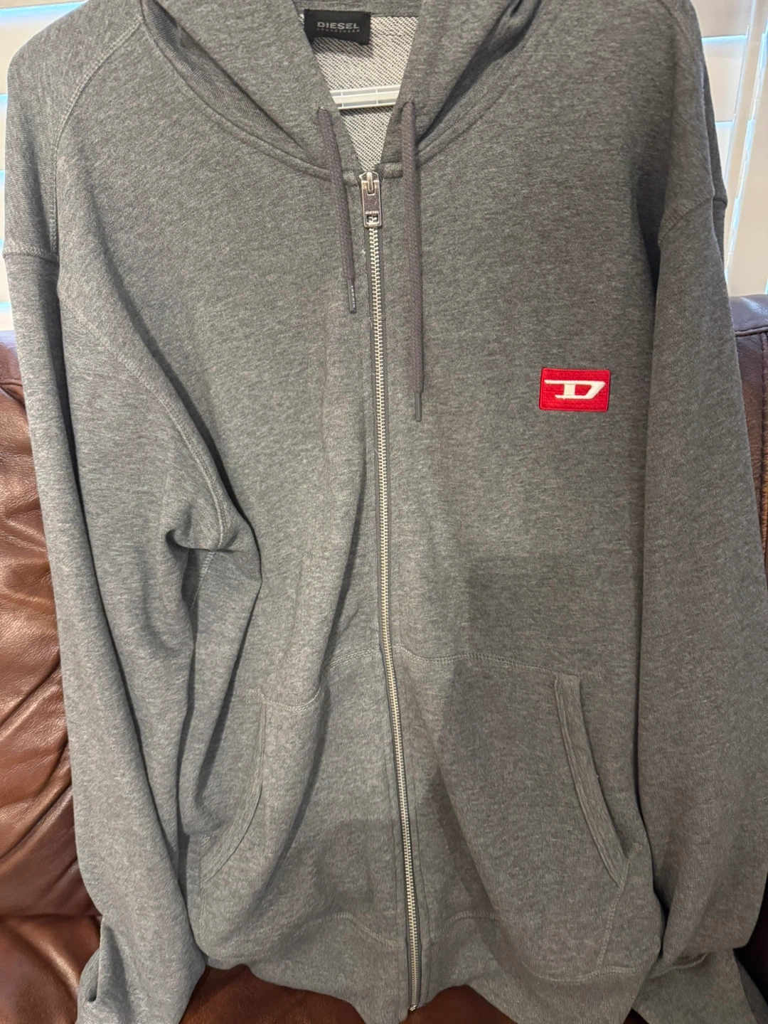 Selling a Diesel full-zip hoodie in grey! It's in great condition and features the Diesel logo on the chest. Perfect for layering or wearing on its own. It's a comfortable and stylish piece for everyday wear