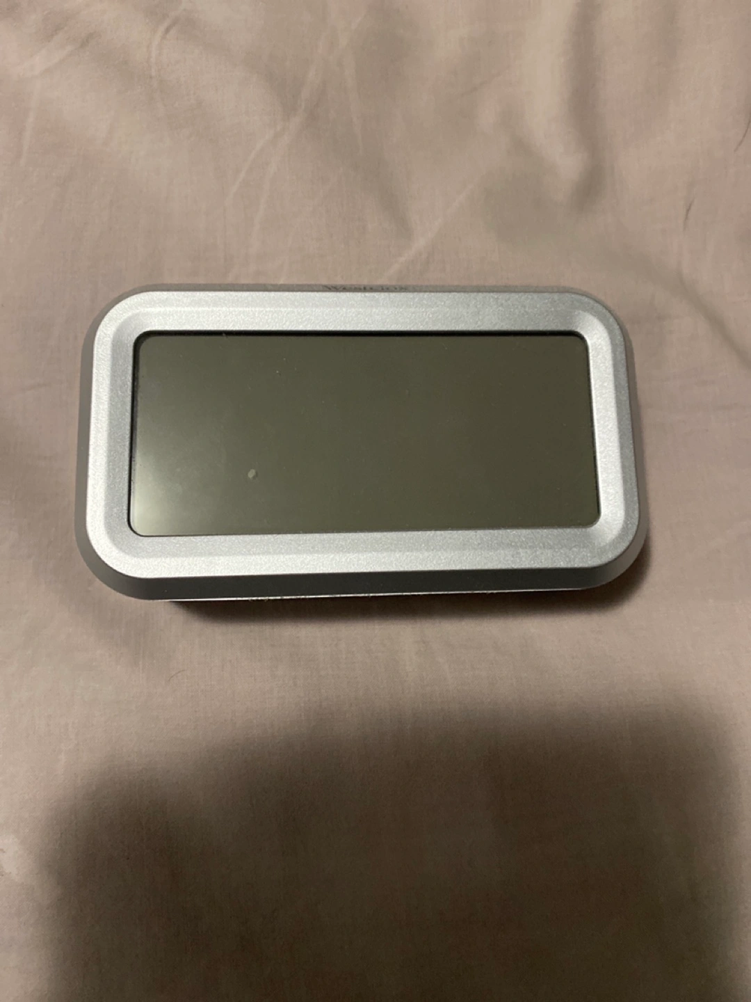 Small digital alarm clock. Features include alarm, time, date, and backlight functions. Made in China. Silver coloured plastic casing.