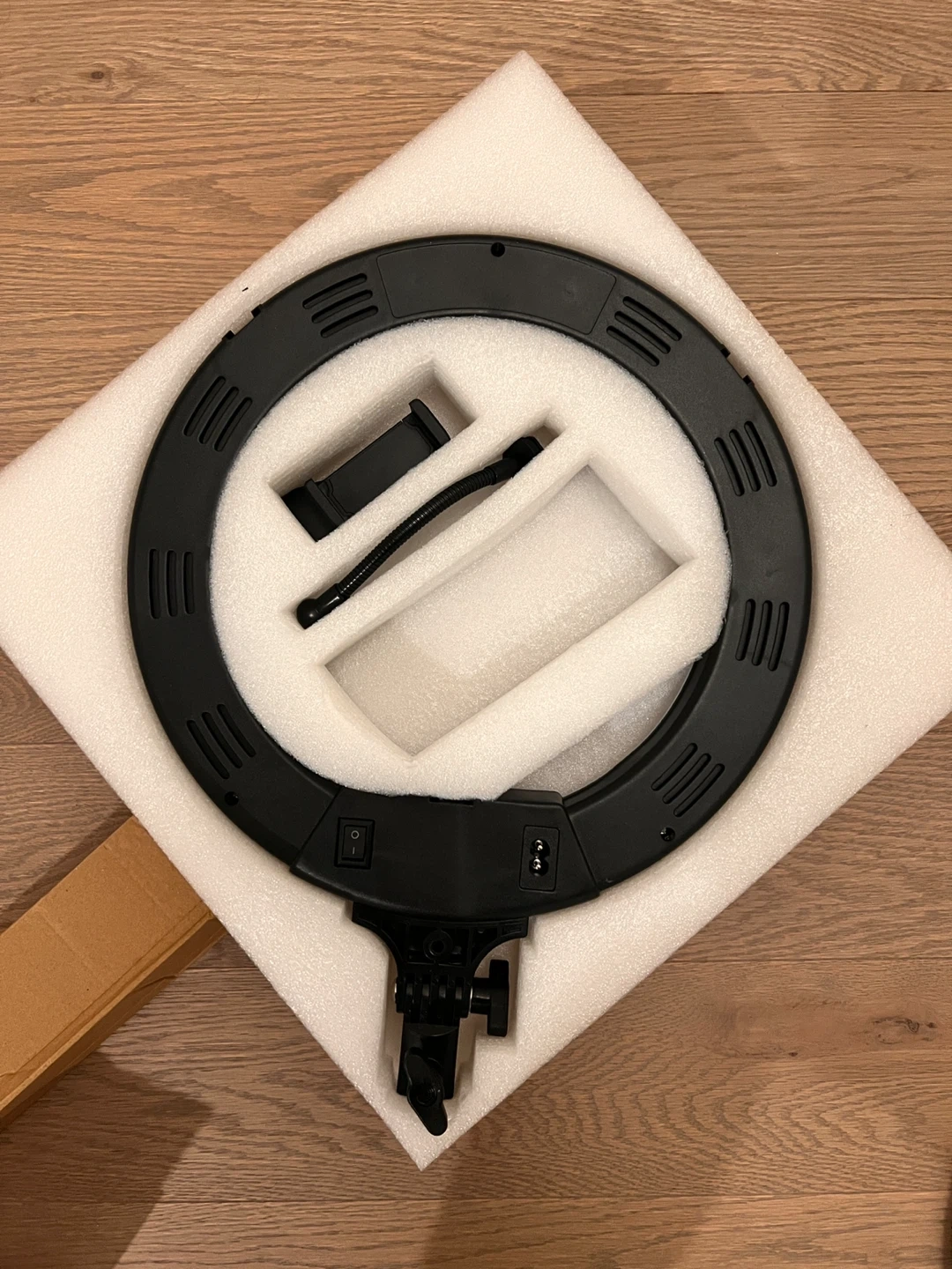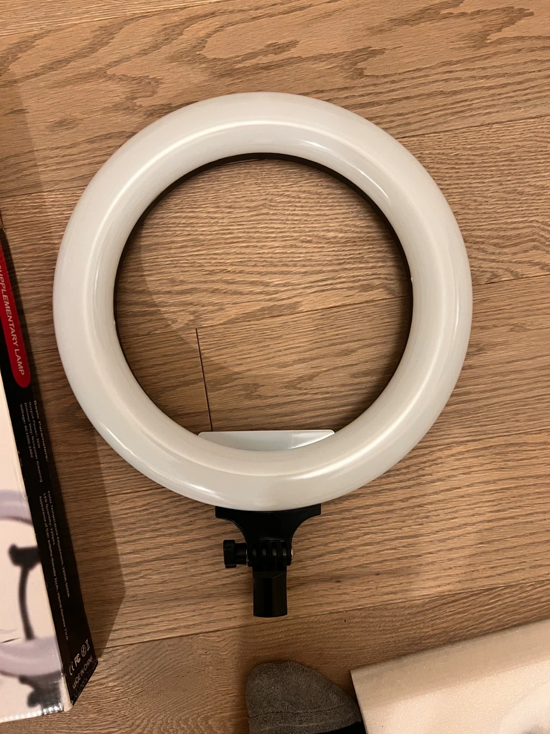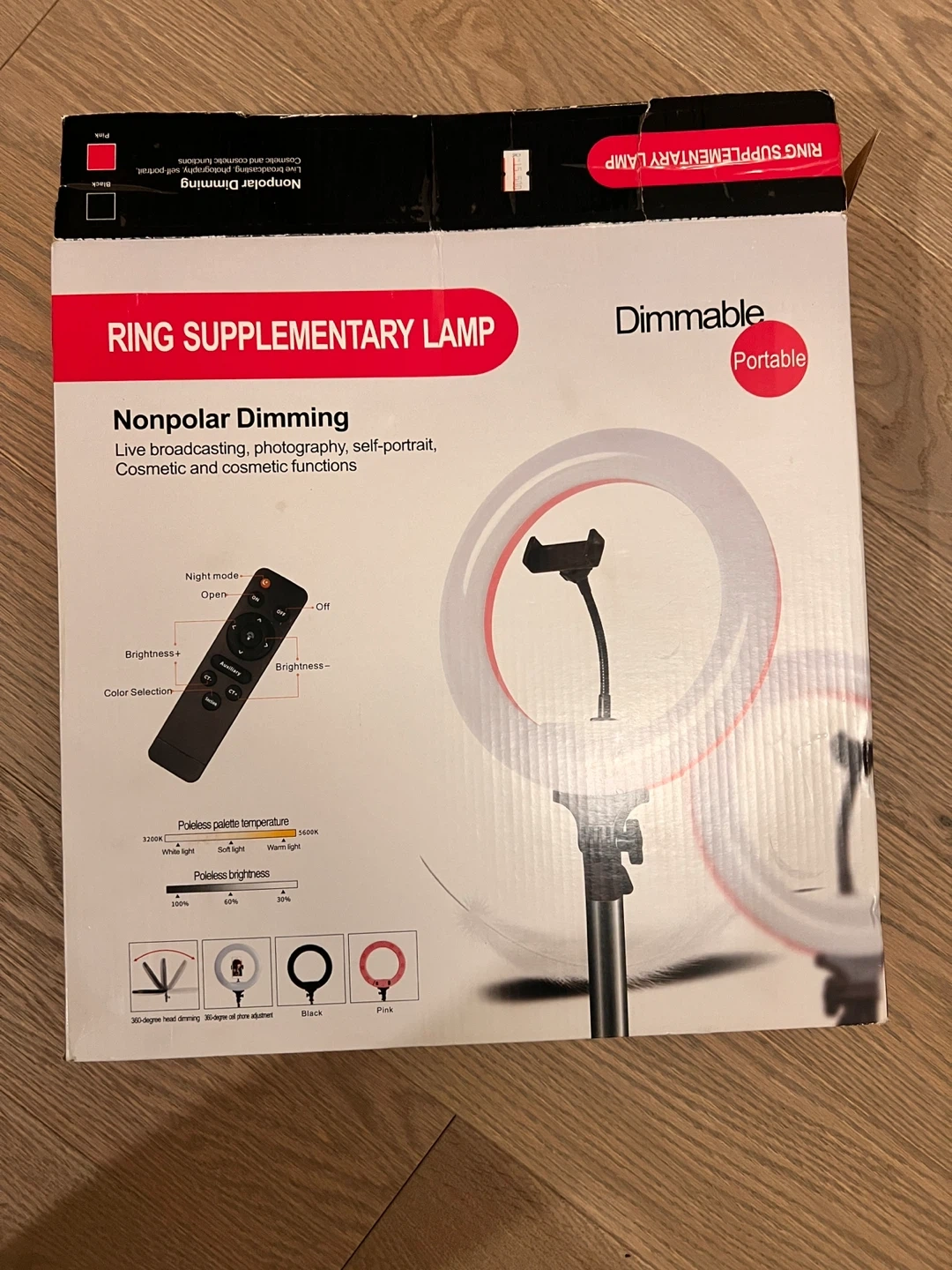 Selling a dimmable and portable ring supplementary lamp! It's perfect for broadcasting, photography, self-portraits, and cosmetic functions. The lamp features nonpolar dimming and comes with a remote for easy adjustments. The box is included!