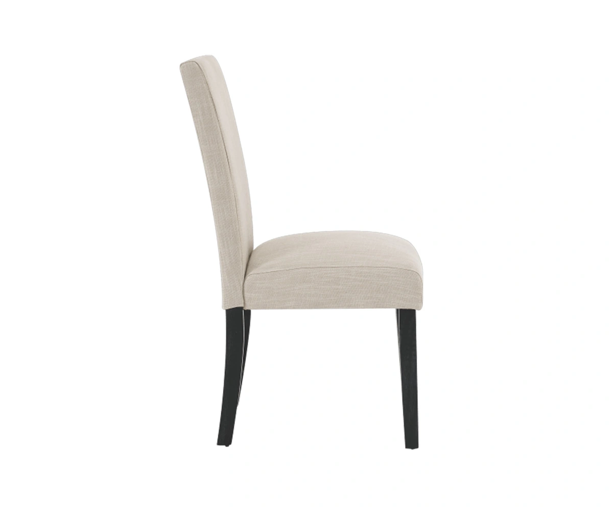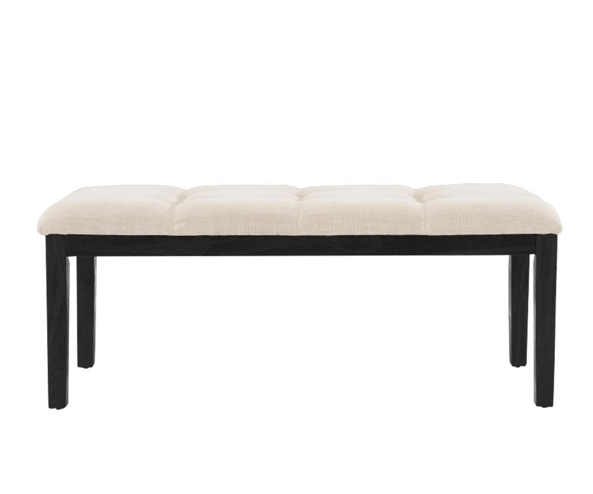 Set of 4 dining chairs and a matching bench. All are upholstered in a light beige fabric with black wood legs. chair - $69 per chair x 2pc per box = $138 for 2pcs. bench - $179. this is clearance sale price. all sales are final. msg to order.