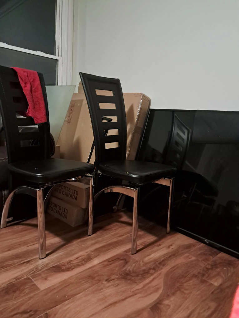 Selling a 2 dining chairs with a sleek black seat and chrome legs. They're in good condition and would look great in any dining room or kitchen brand new still in the box assembly required. bought 6 my is too small.