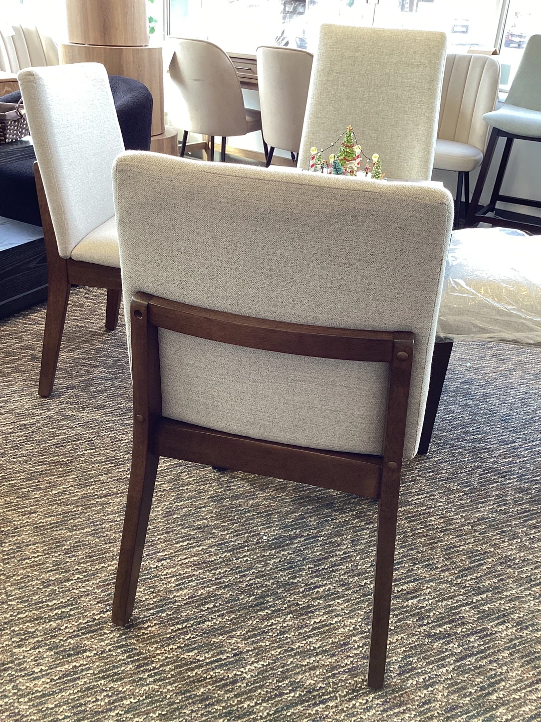 Selling a set of four dining chairs. They feature a neutral-toned fabric and sturdy wooden frames. These chairs would be a great addition to any dining space!
