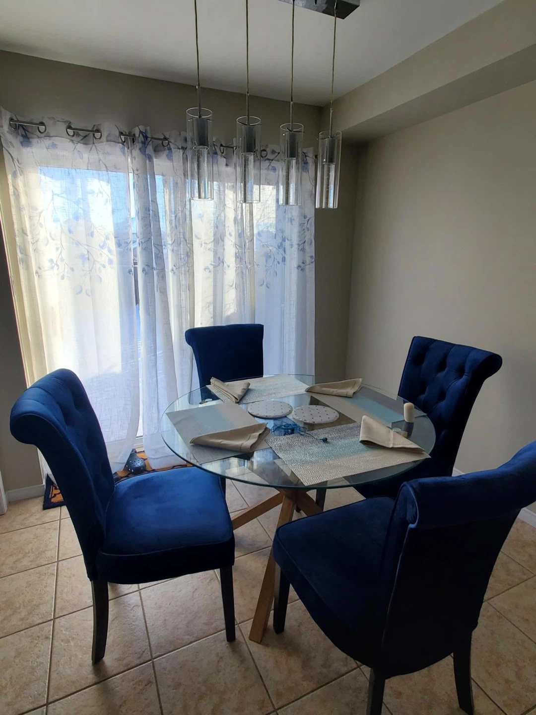 Selling a lovely dining round glass table with light brown base. Perfect for a smaller dining area or kitchen nook!