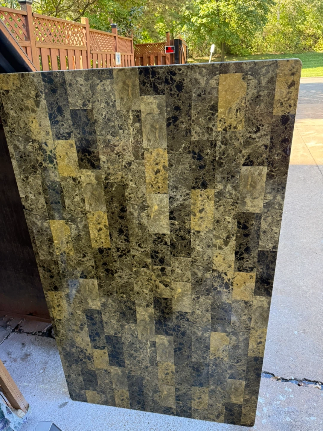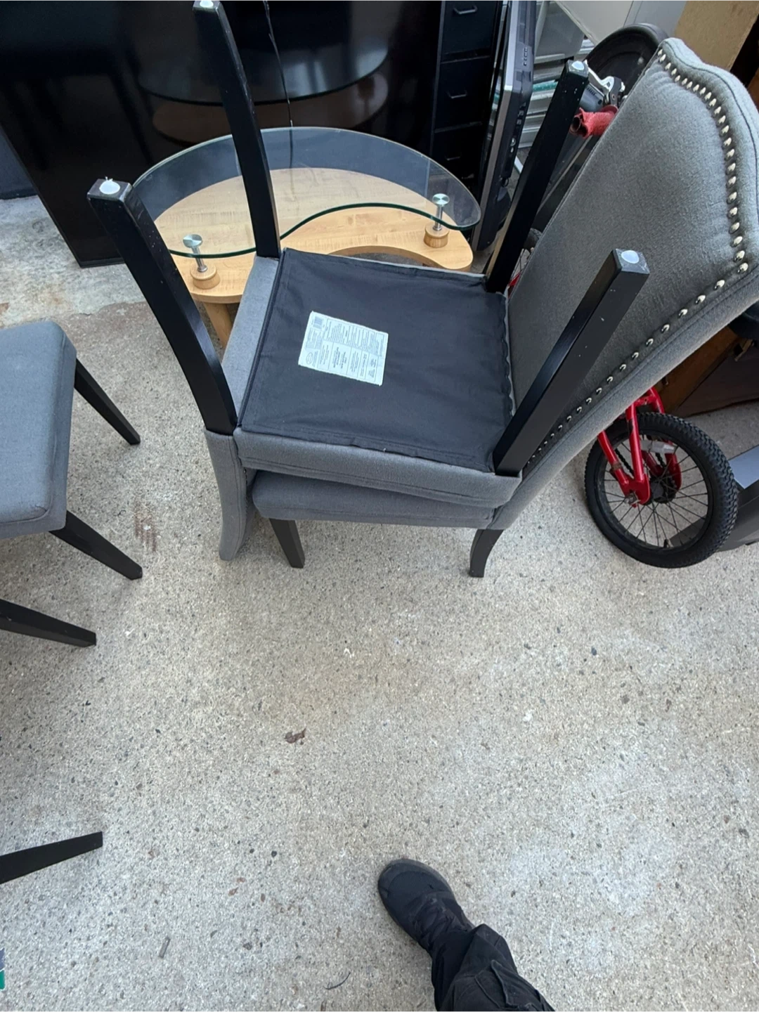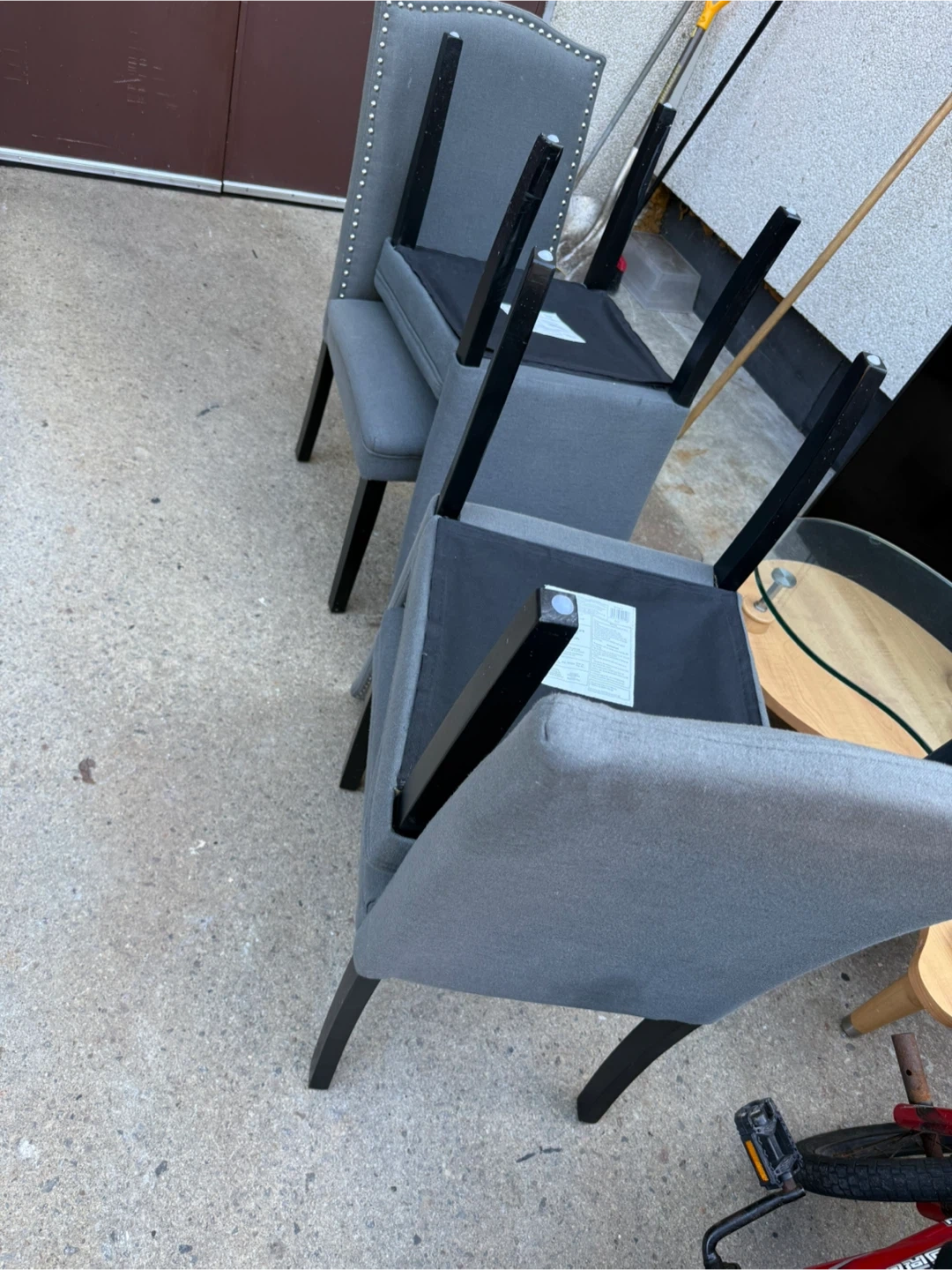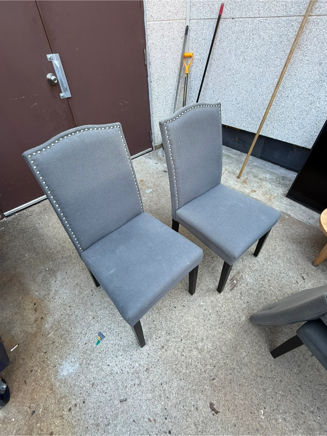 Beautiful laminated marble-style dining table in earth tones (brown/green mix) with four upholstered grey chairs. Chairs feature sturdy black wooden legs and decorative nailhead trim. ✅ Excellent condition ✅ Sturdy and elegant design ✅ Perfect for kitchen, dining room, or condo 💲 Asking $40 or best offer. 📍 Pickup only. Selling a set of gray upholstered dining chairs. They're in good condition and would look great in any dining room!
