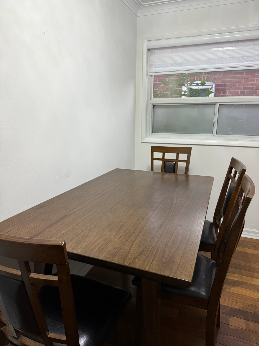 Selling a dining table with five chairs. It's a great set for any dining room! Dimensions table : Width: 36" (91.4 cm) Height: 30" (76.2 cm) Depth: 60" (152.4 cm) Dimensions chair: Width: 17.5" (44.5 cm) Height: 39.25" (99.7 cm) Depth: 21" (53.3 cm)