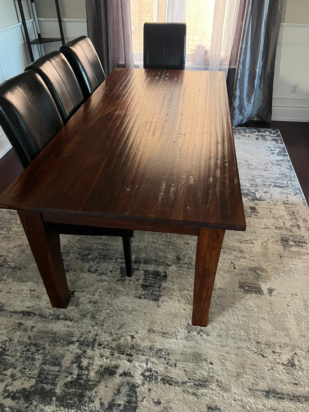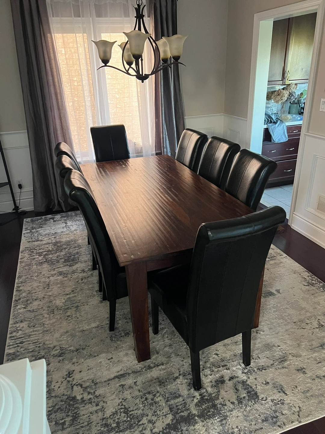 Selling a dining table with six black chairs. The table has a dark wood finish and is in good condition. Perfect for a family or anyone who loves to entertain! The chairs are comfortable and stylish, complementing the table nicely