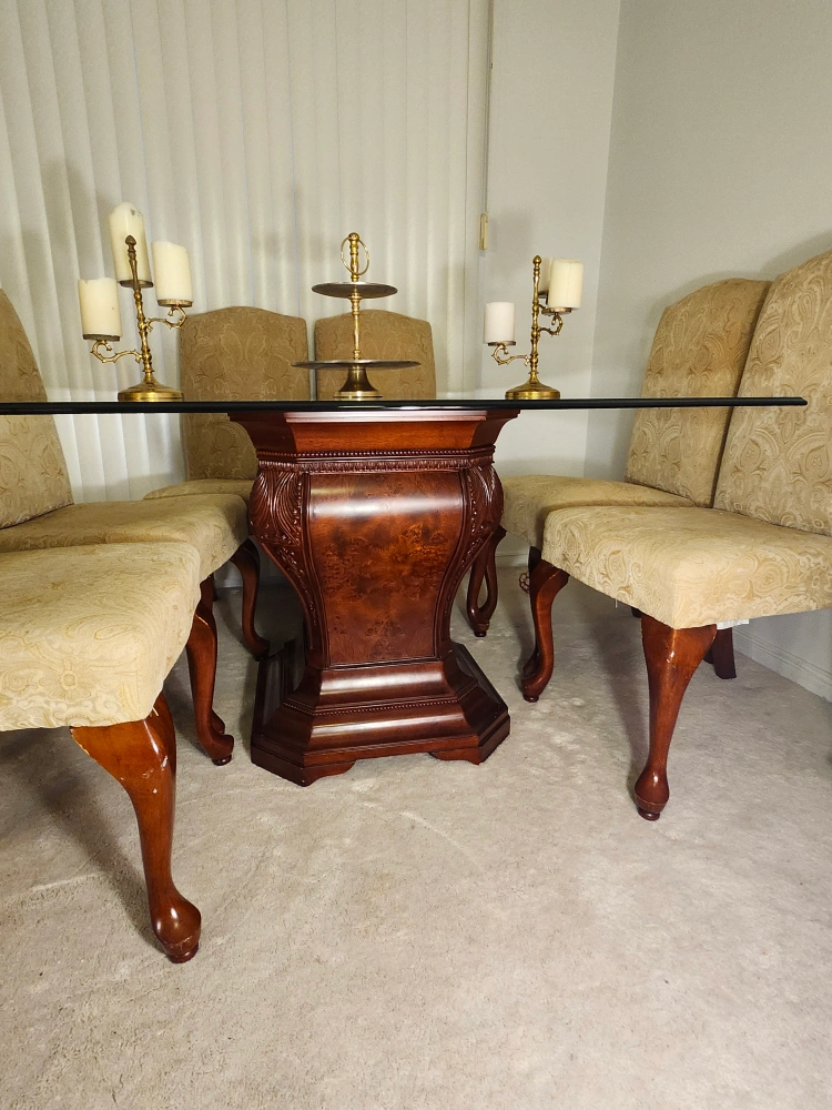 Selling a dining table with six chairs. The table has a glass top and a dark wood base with intricate carvings. The chairs are upholstered with a patterned fabric and have wooden legs. The set is in very good condition and would be a great addition to any dining roo.